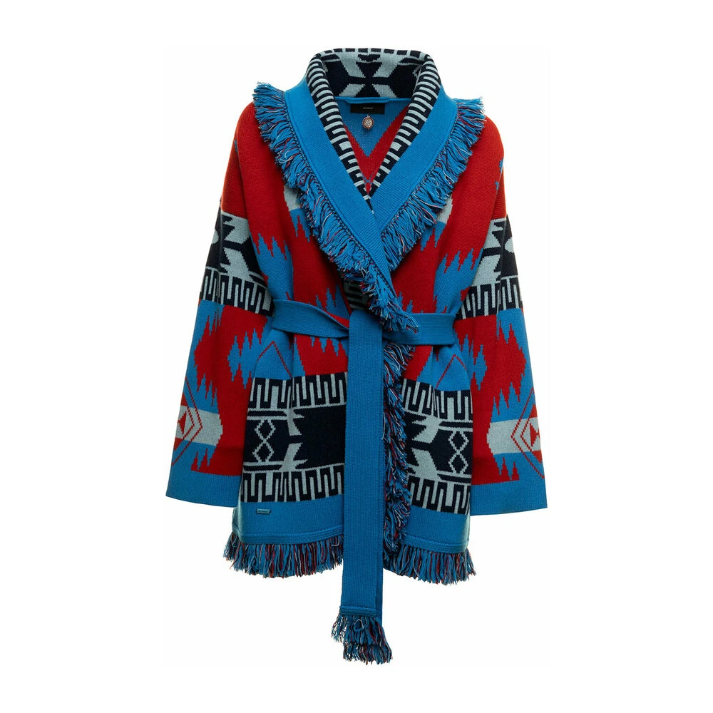 Alanui Gensere Red Cardigan V-hals Multikolor kashmir Geometrisk trykk Midje Belt Fringed Edges To lommer foran lange ermer store passform