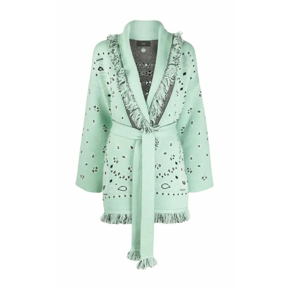 Alanui gensere grønn lukking med matchende belte festet til midjen sjalkrage med frynsete kanter lange ermer; Sidelommer Fringed Finishes Bandana Pattern in All-Over Jacquard Logo Label sydd på fronten Overize Green Color 100% Cashmere Made ; i ItalyItem i foto tilsvarer størrelse s.mannequin størrelse: 42 it.ManNequin Målinger: Høyde 1.75cm, bust / Bryst 85 cm, midje 65 cm, skulder 44 cm, hals 36 cm, armlengde 57cm, håndleddsomkrets 16cm, brystnivå 26cm, knestreng 66cm