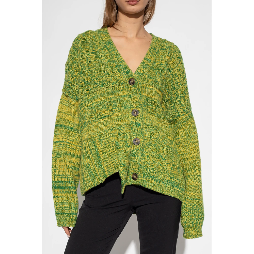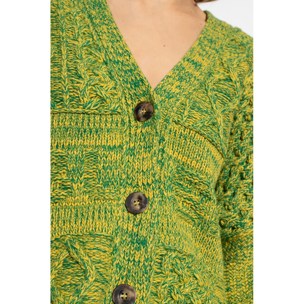 Grønt og gult cardigan fra bakhold. Denne stilen er laget med en ribbet strikket, og har en avslappet passform, en V-pengelinje, knappfester, lange ermer og en asymmetrisk hem.