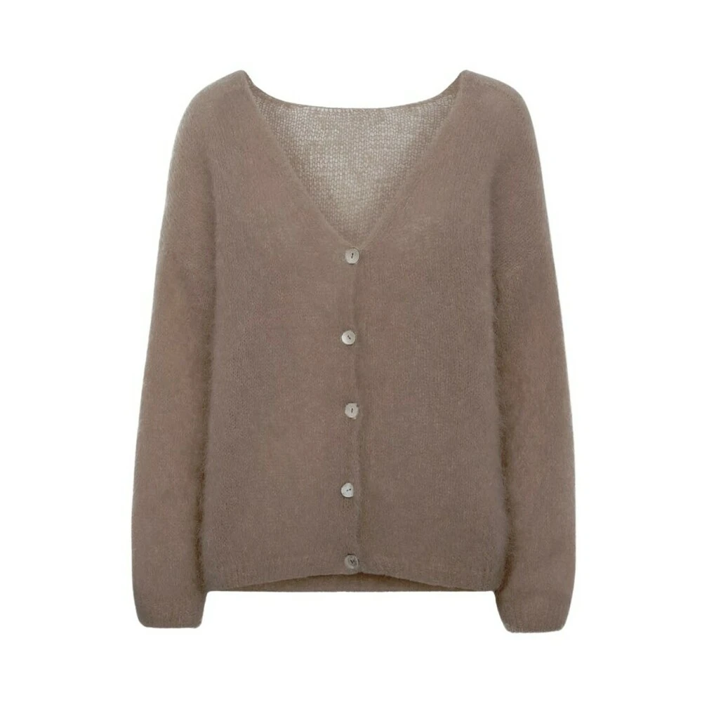 American Dreams Cornelia Cardigan mid Brązowy Myk og deilig oversized cardigan i en delikat brun farge. Cardiganen har lange ermer, v-skjæring og lukkes med dekorative knapper. Kan brukes begge veier. Passer perfekt over sesongens fine sommerkjoler eller utover høsten. Oversized passform. Materiale: 78% mohair, 18% polyamid, 4% ull. Vaskes på kaldt ullprogram og ikke høyere sentrifugering enn 400 omdreininger.