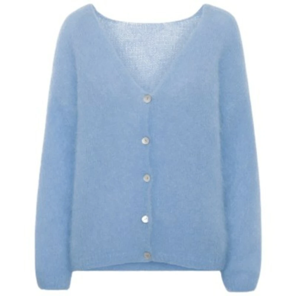 Denne vakre cardiganen er strikket av tynt mohair garn og har knapper hele veien gjennom. Jakken kan brukes begge veier og er også lekker med en dyp v – utrigning på ryggen. Bruk den som en lekker topp eller lag på lag med en kjole. Made in Italy. 78% mohair, 18% polyamide, 4% wool.