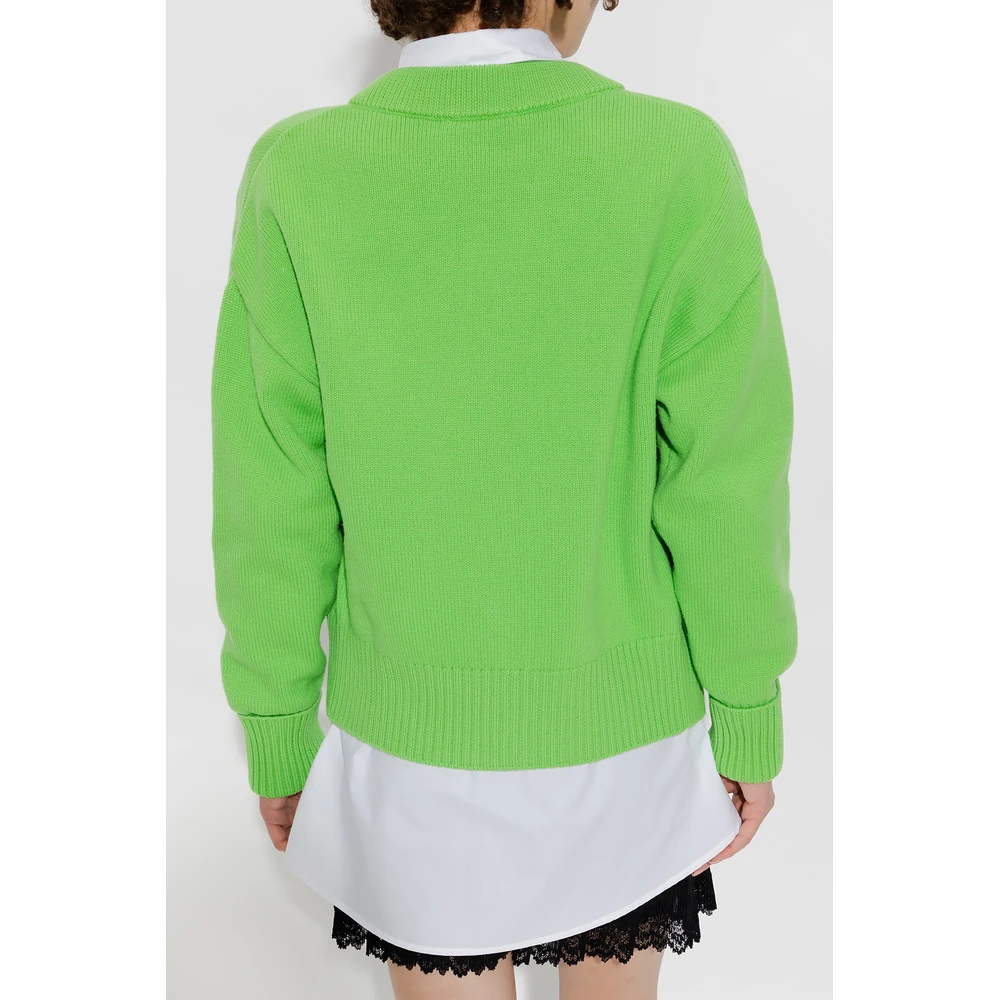 Grønn cardigan fra Ami Alexandre Mattiussi. Dette plagget er laget av jomfruelige ull, og har knappfester, svart ami de Coeur-logo-detalj og ribbestrikkede trimmer ved V-halsen, hem og mansjetter.
