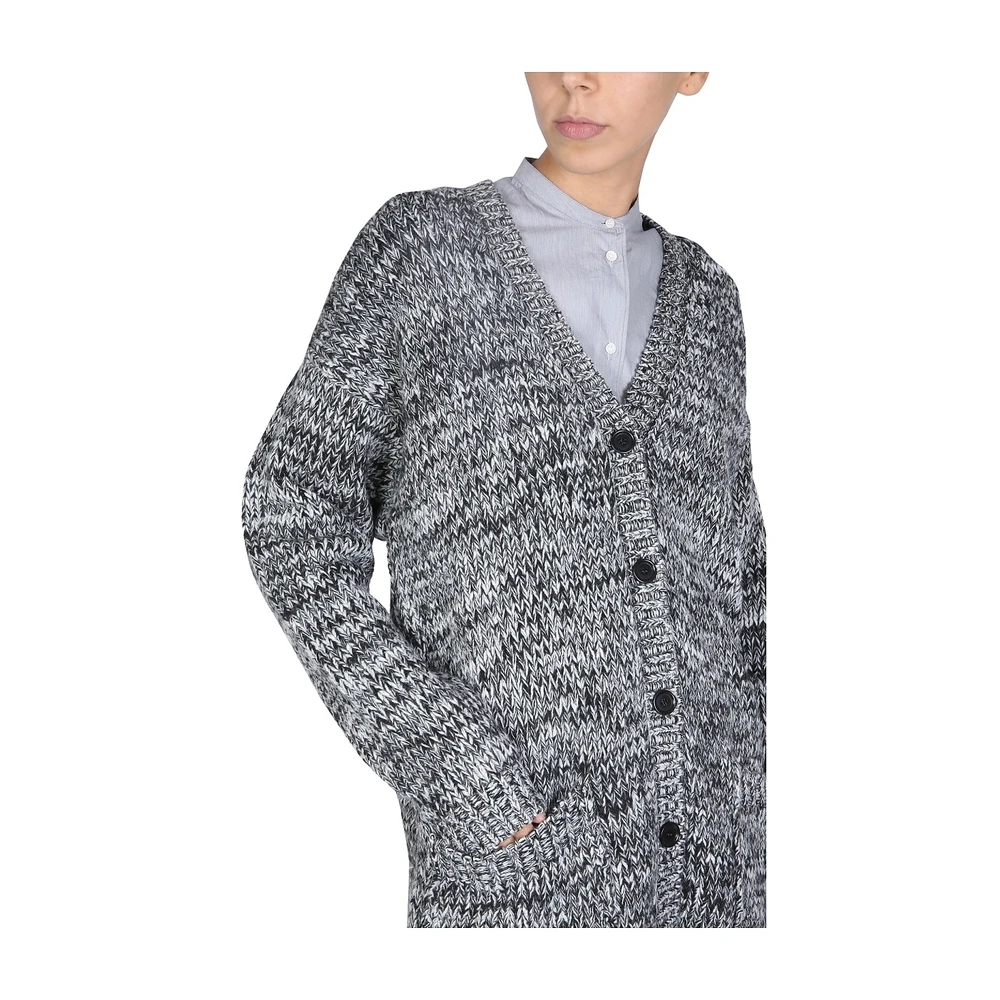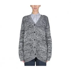V-hals, lukking foran, to lommer foran, modellen er 180 cm høy og har størrelse.