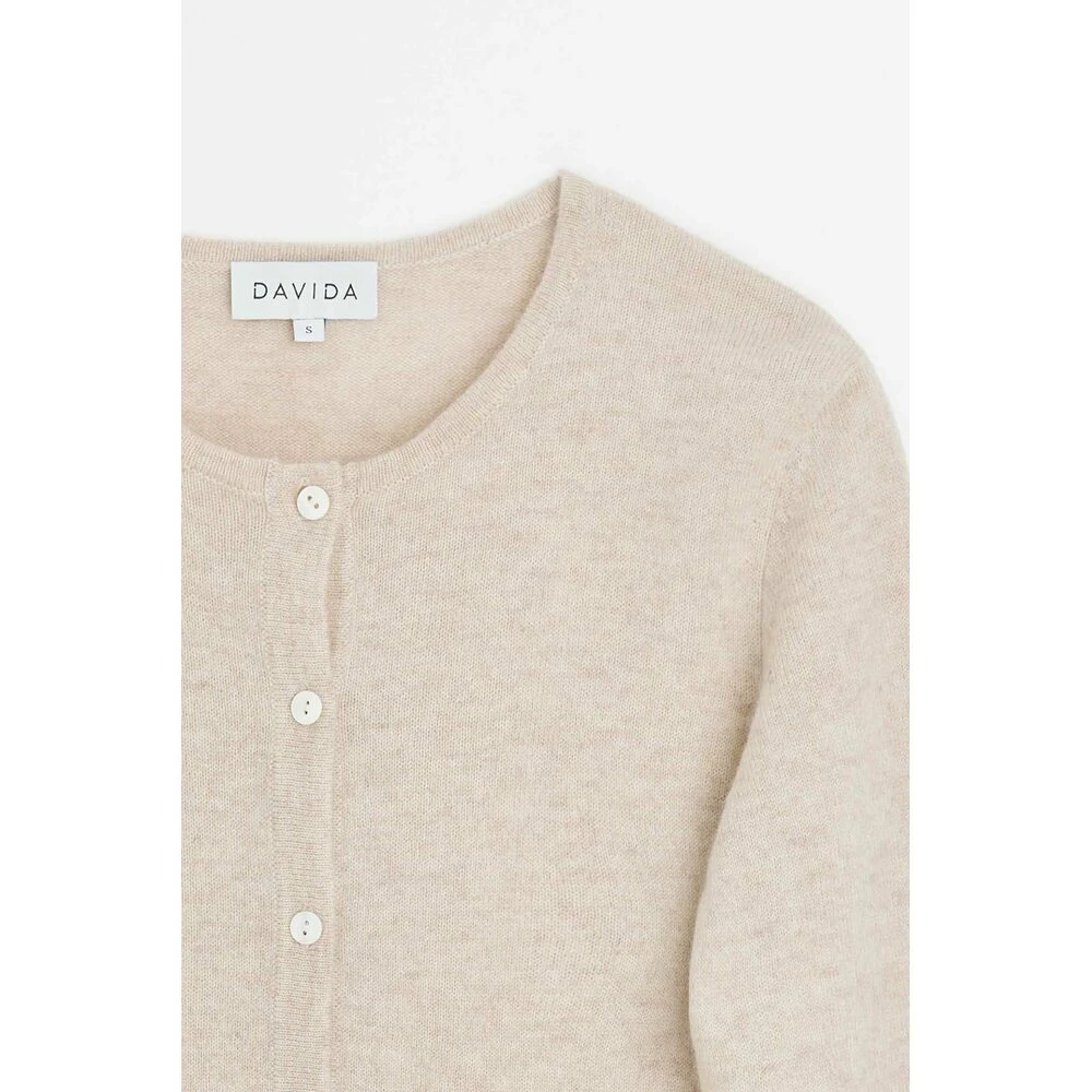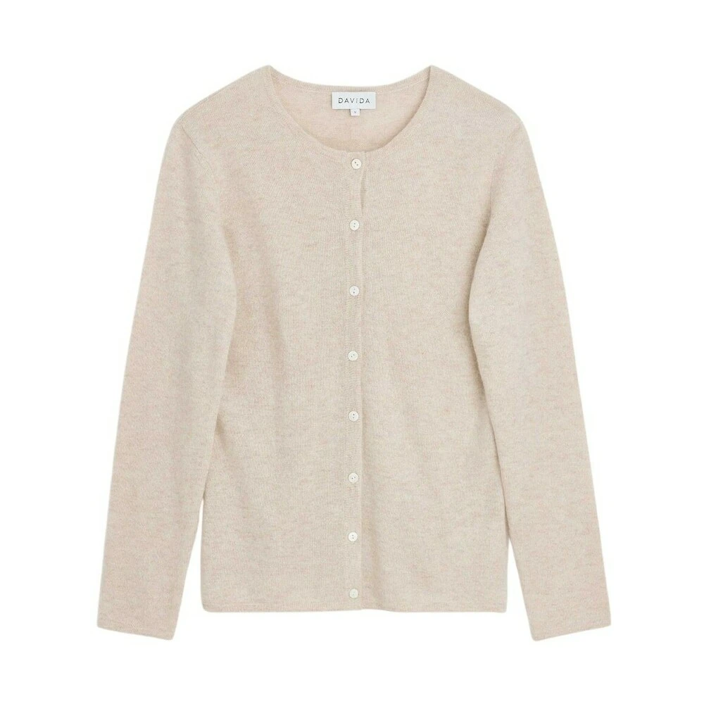 Navn : Davida Classic Cardigan Farge : Beige/ Light beige Beskrivelse: En ensfarget klassisk cardigan med 8 små knapper som går ton i ton. En cardigan med høy rund hals og smale ermer. Like fint oppknappet som åpent, så bruksområdene er mange. Style den gjerne med en t-skjorte, tanktop eller hvorfor ikke med en crisp skjorte. Materiale :100% kashmir – Lengden er 59 cm i størrelse Small