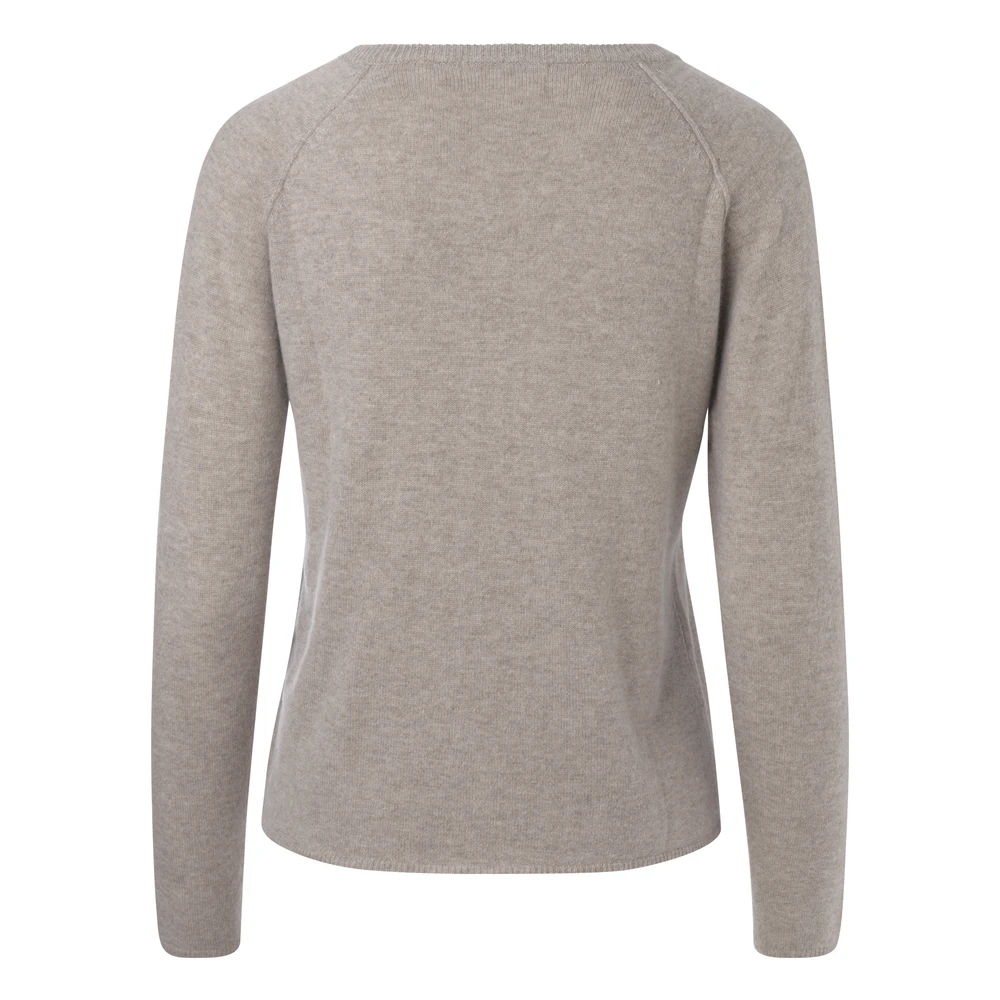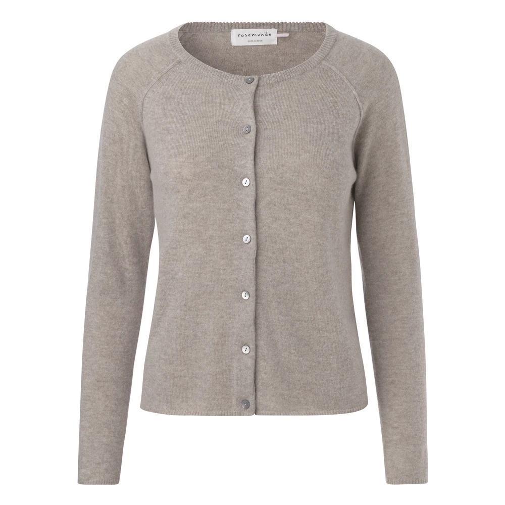 Beige cardigan fra Rosemunde, med monofargede knapper foran. Den er myk og deilig med sin ull- og kashmirkvalitet. Litt kort i modellen, ellers normal i størrelsen. Inneholder 70% ull og 30% kashmir. Håndvask eller skånsom ullvask.