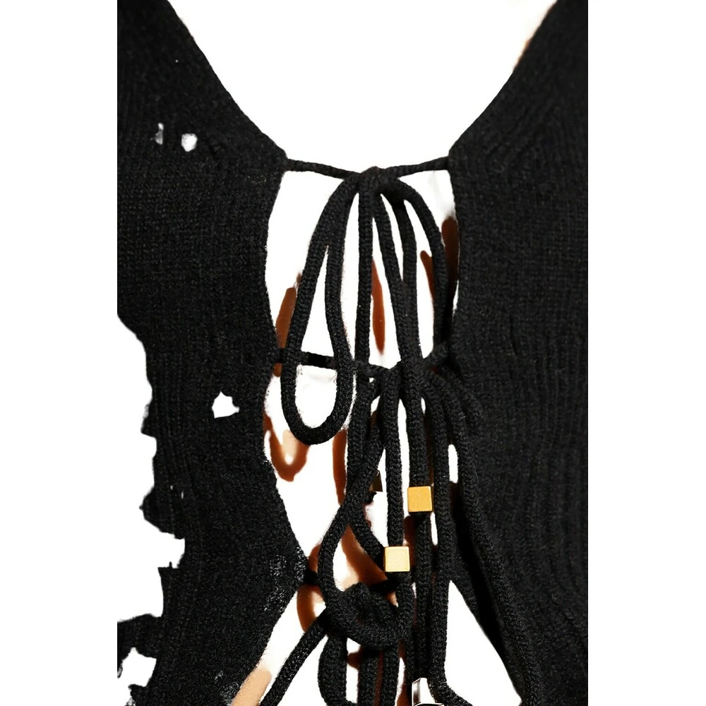 Svart cardigan fra Blumarine. Denne stilen er laget av en ull- og kashmirblanding med en beskåret passform, og har en omfattende krage, en snorfesting på fronten og ribbestrikket på kragen, underhemmen og mansjettene.