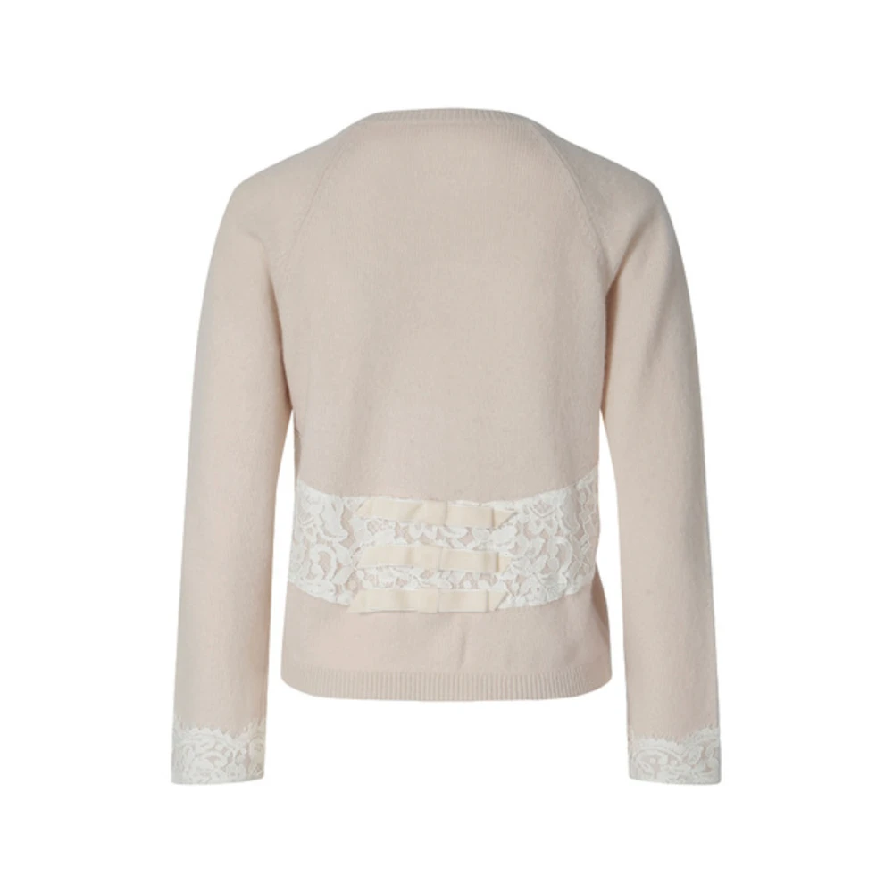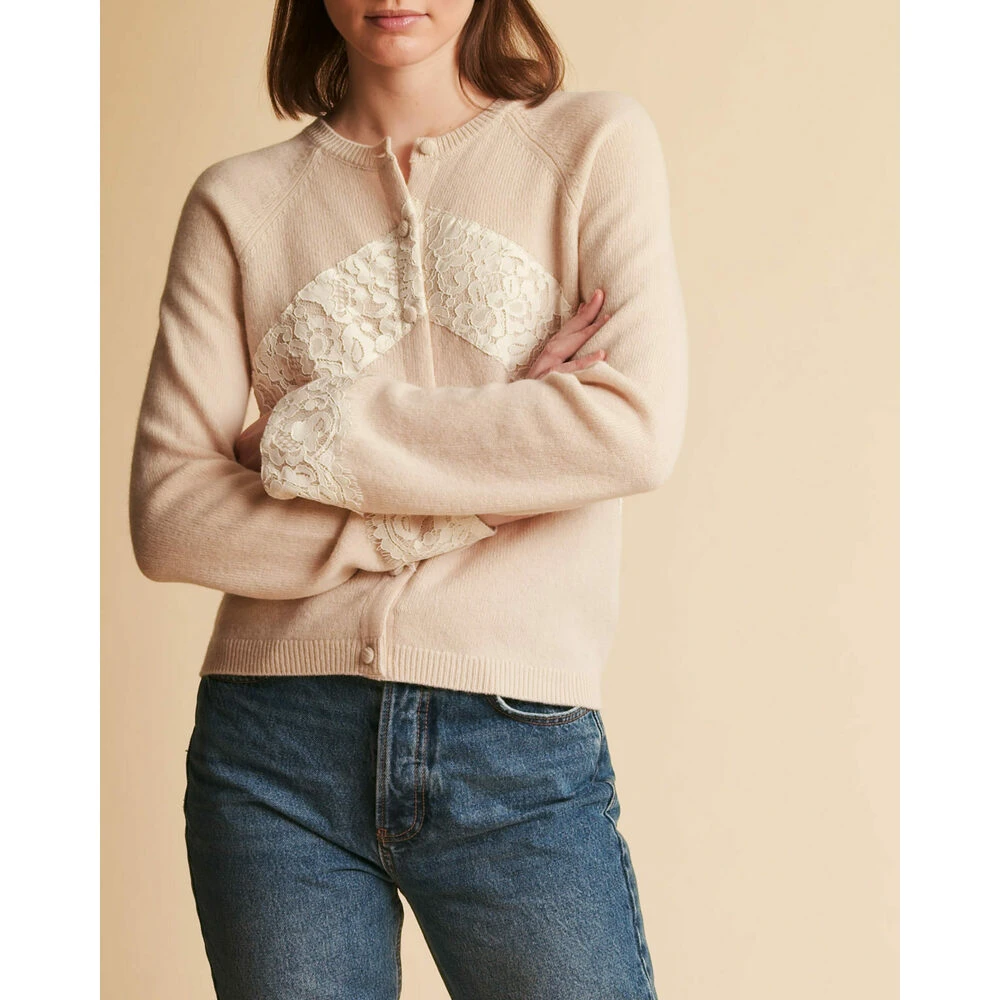Beskrivelse: Lekker cardigan med påsydd blondedekor i offwhite. Nydelig cardigan som kan brukes både til hverdags og fest.