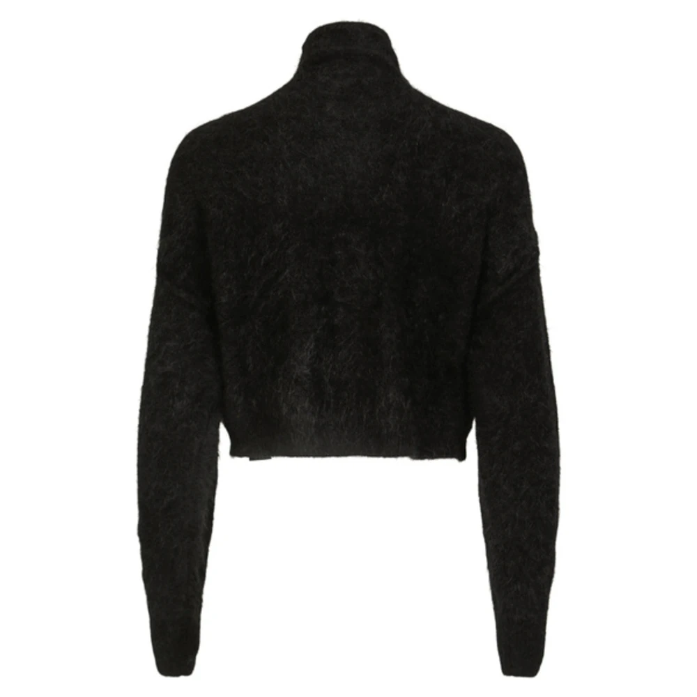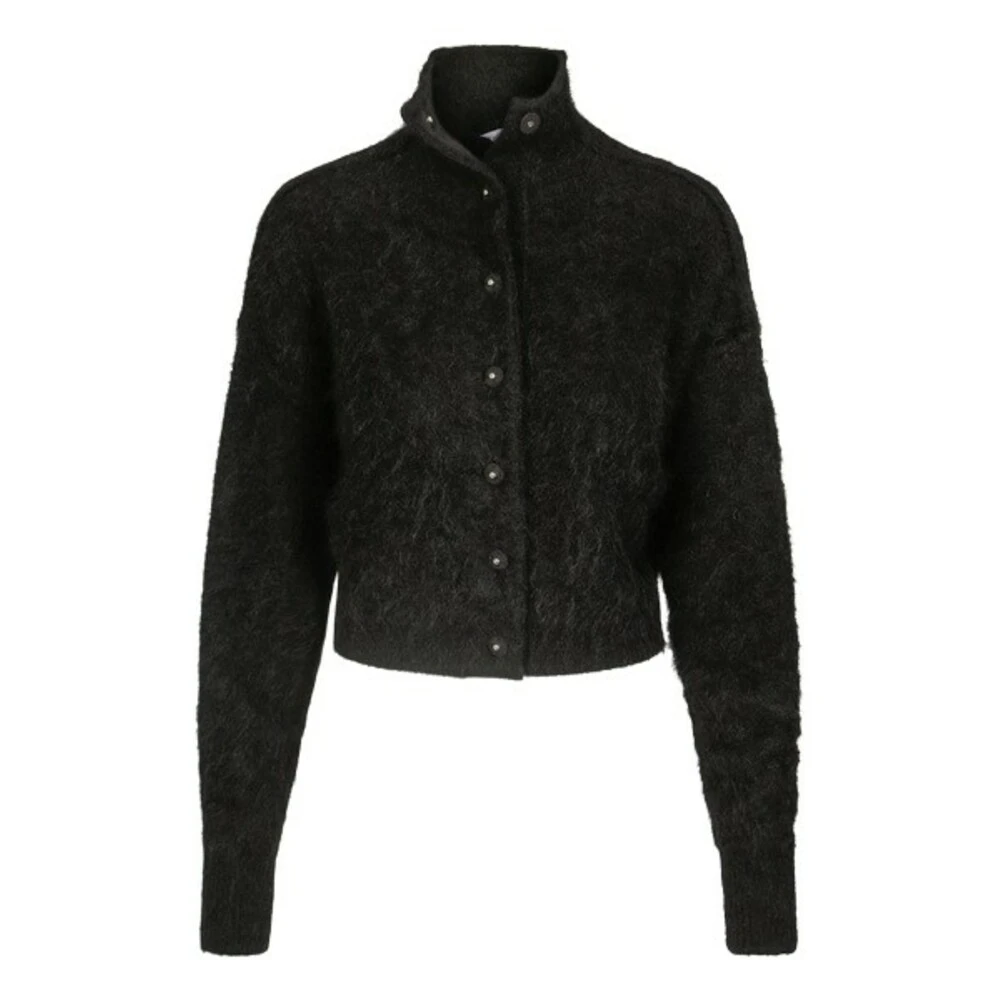 Strikket kort cardigan med høy krage laget av myk og delikat mohair blend. Cardiganen har kledde trykk knapper og ribbestrikkede smale ermer.