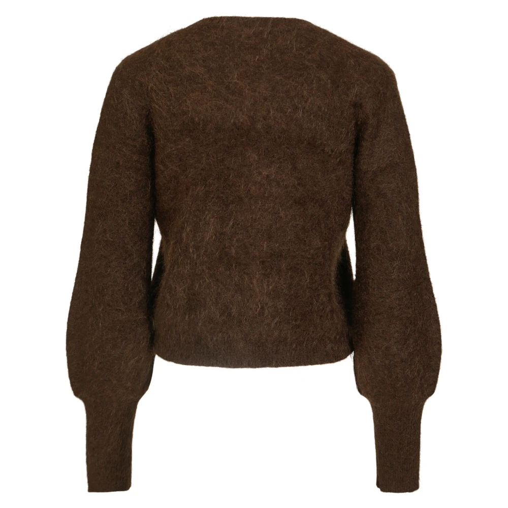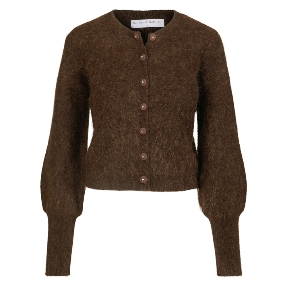 Navn: Cathrine Hammel Mohair petit cardigan Farge: Brun/ Dark brown Beskrivelse: Strikket nett cardigan med klassiske kledde trykk knapper laget av myk og delikat mohair blend. Cardiganen har rund hals, ribbestrikkede smale ermer og ribb kant ved hem. Materiale: 34% Kid mohair, 34% ull, 27% polyamide, 5% elastan