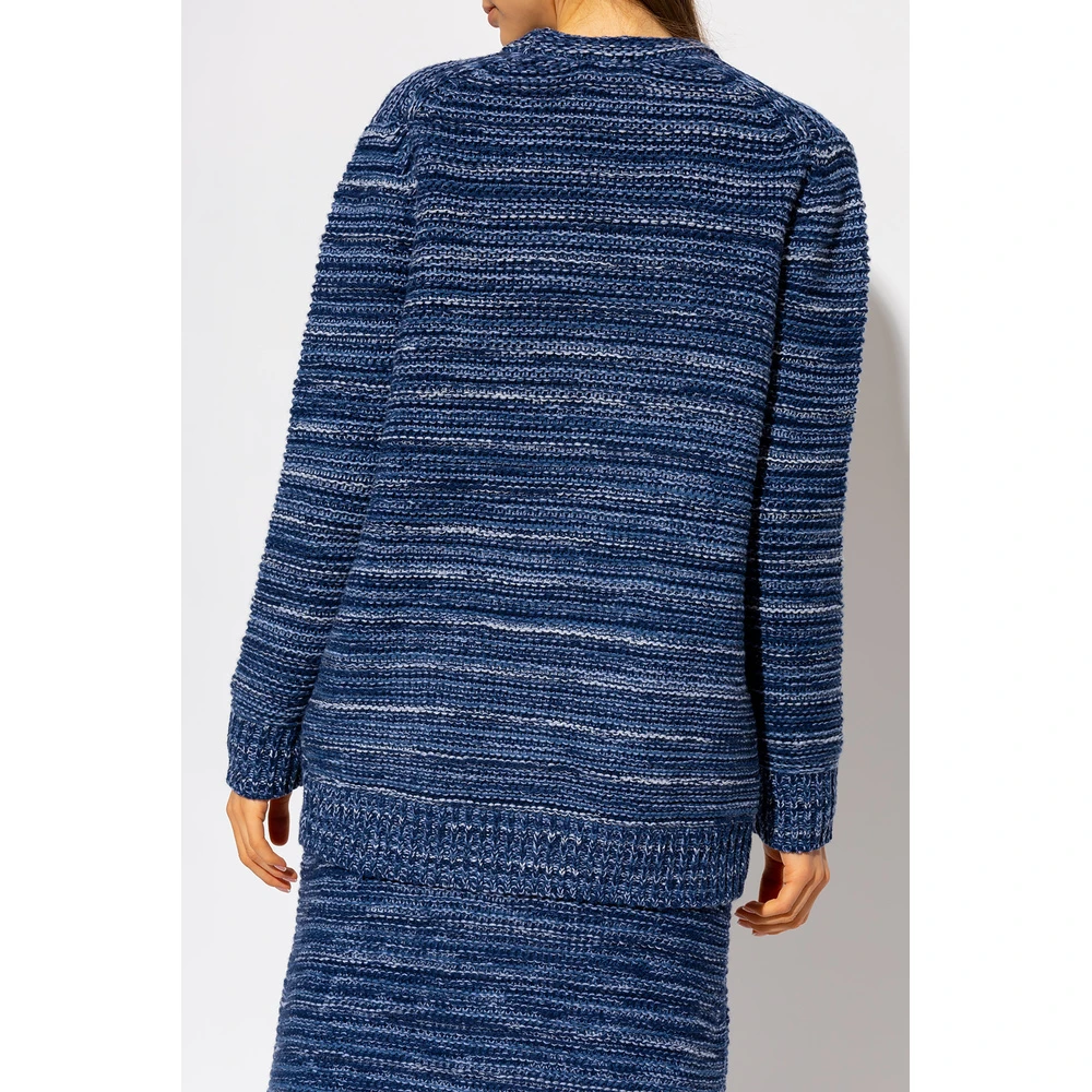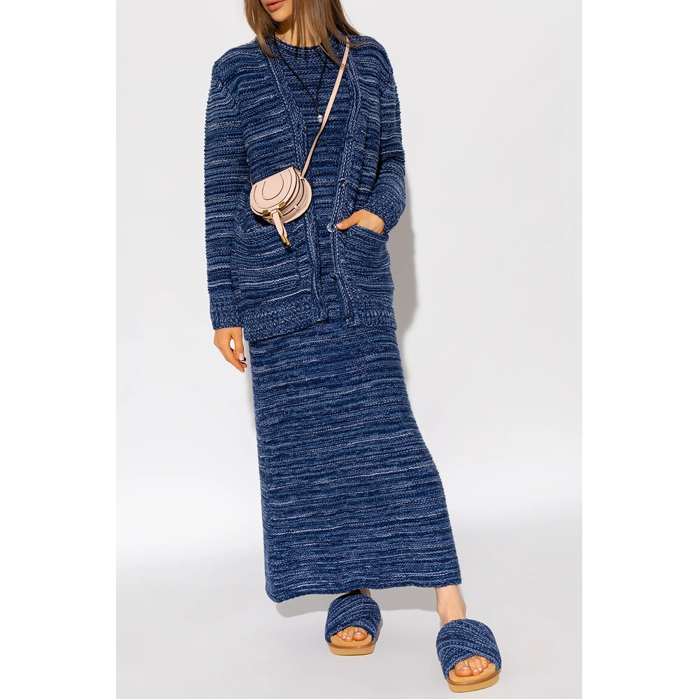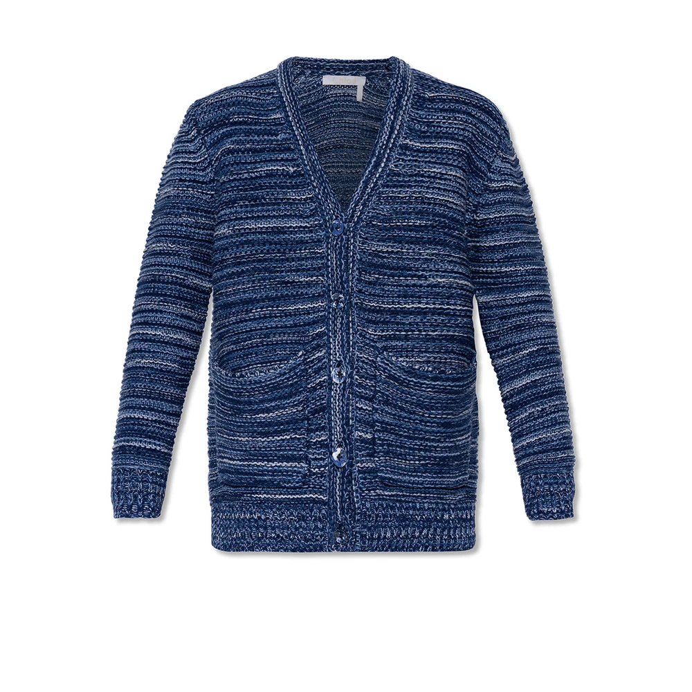 Blå cardigan fra Chloé. Denne modellen er laget av kashmir, og inneholder dekorative keramiske knapper, en tykk strikk, to glidelommer og ribbestrikkede trimmer ved V-halsen, hem og mansjetter.