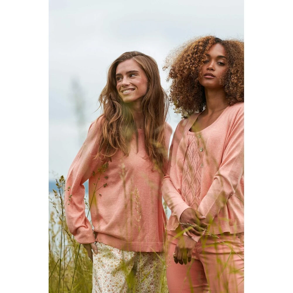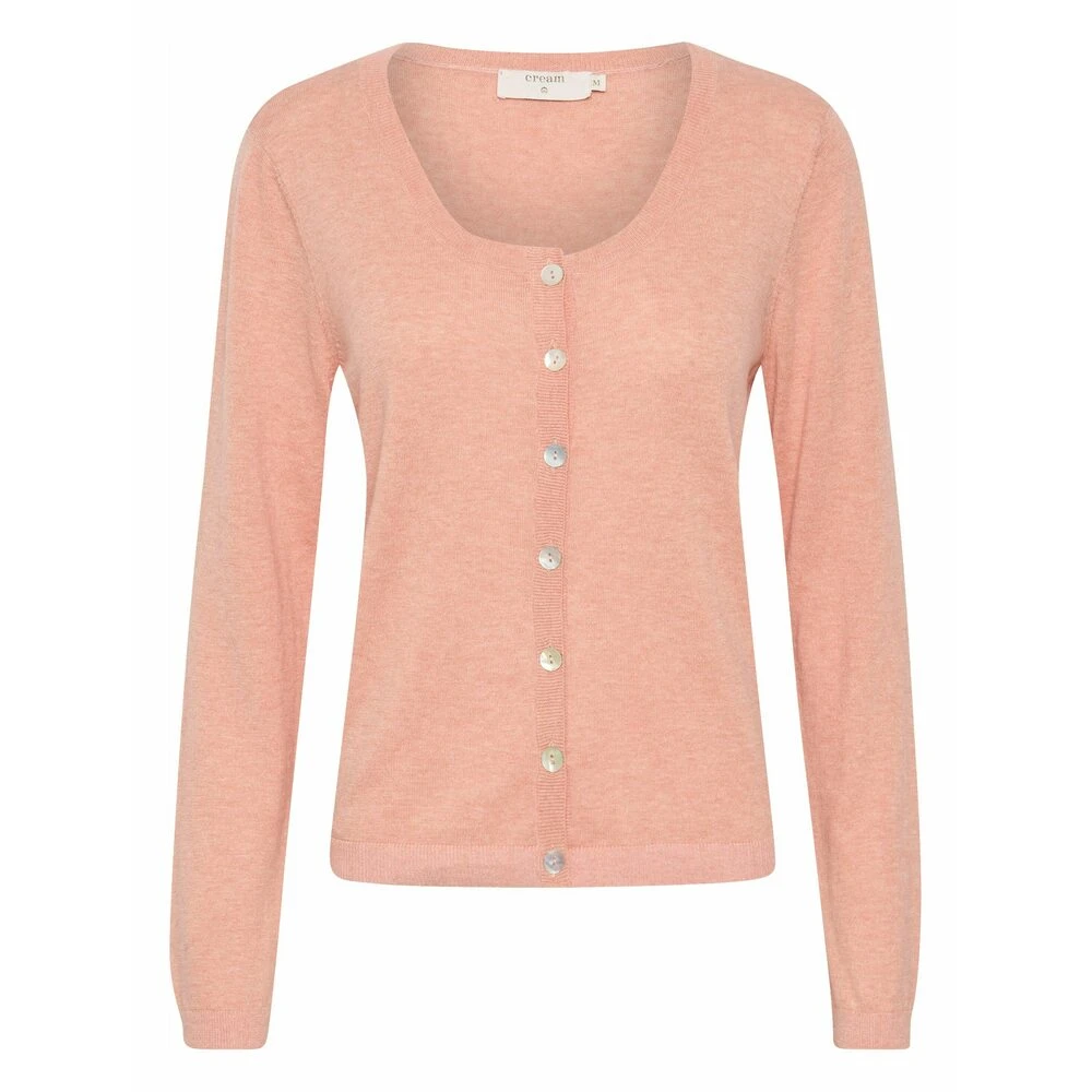 Tynn og myk Cardigan fra Cream i fargen coral. Finnes i Placid blue, burnt coral, Eggnog Melert og Mørk Beige Melert. Og finnes også som tynn og lett genser. Den har rund hals og lang arm. Lengde i st. M: ca. 52 cm. Innhold: 80% Bomull 20% Kashmir Vask: 30*