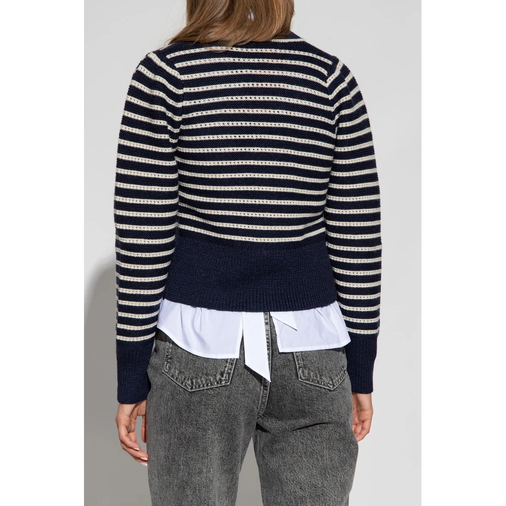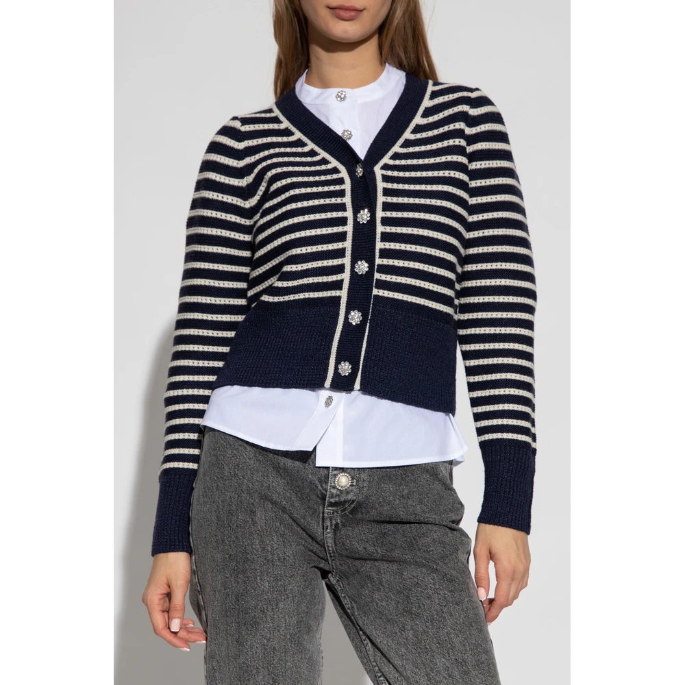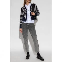 Navy Blue og Cream ‘Thuva’ fra Custommade. Denne stilen er strikket fra bomull, og har et stripemønster, en V-hals, lange ermer og blanke knapper.