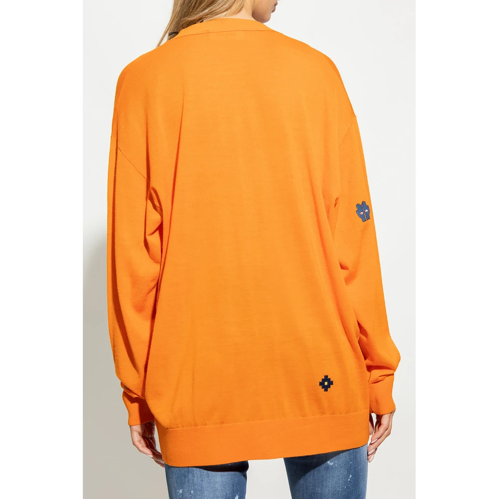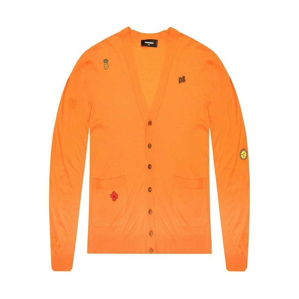 Orange Cardigan fra DSquared2. Dette store plagget er laget av ull, og har flerfargede flekker, logo-detaljer og ribbestrikkede trimmer ved V-halsen, hem og mansjettene.