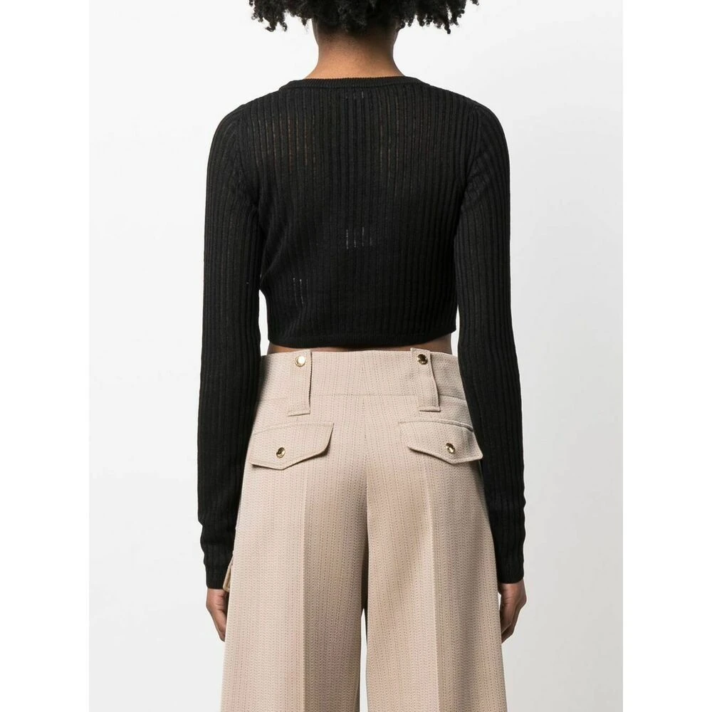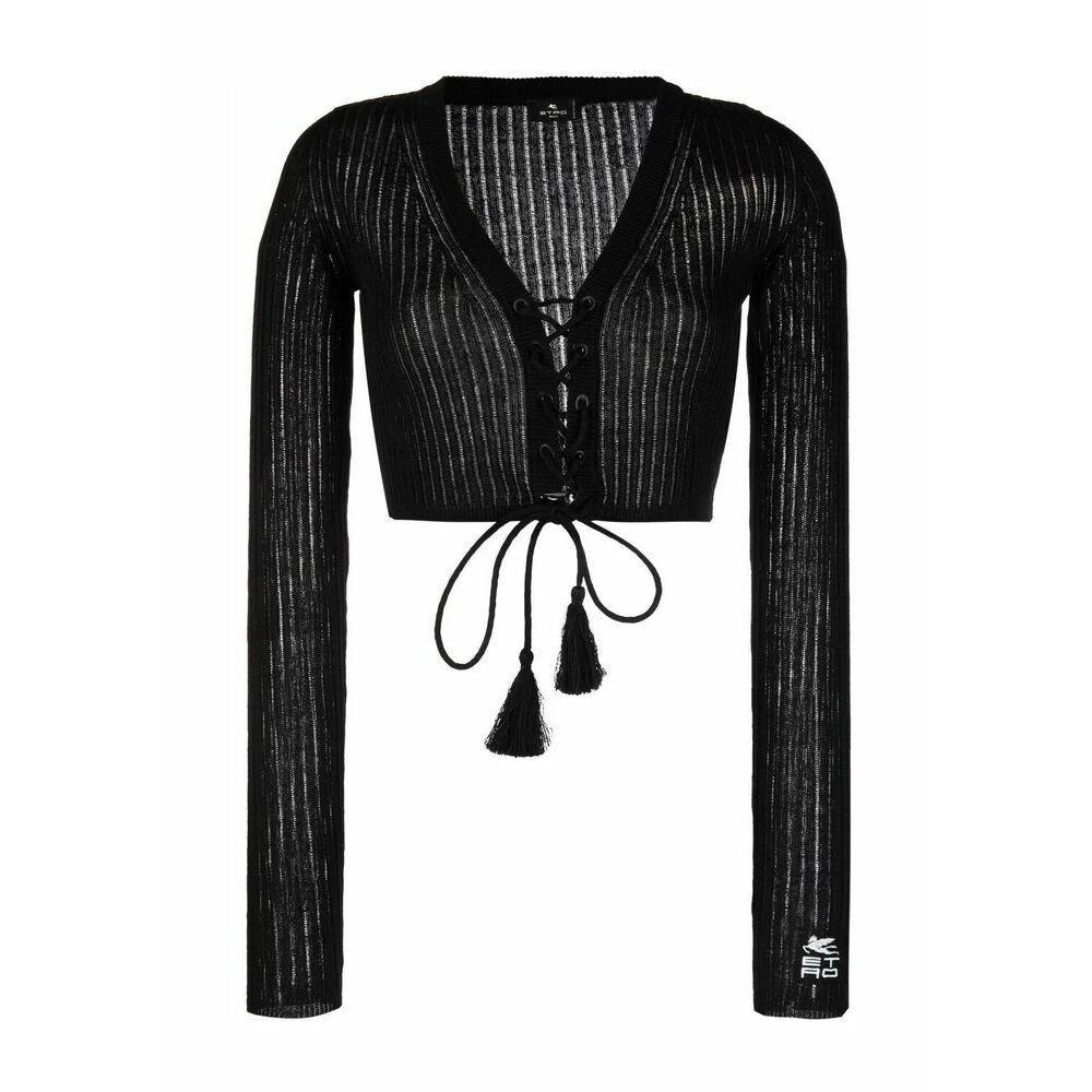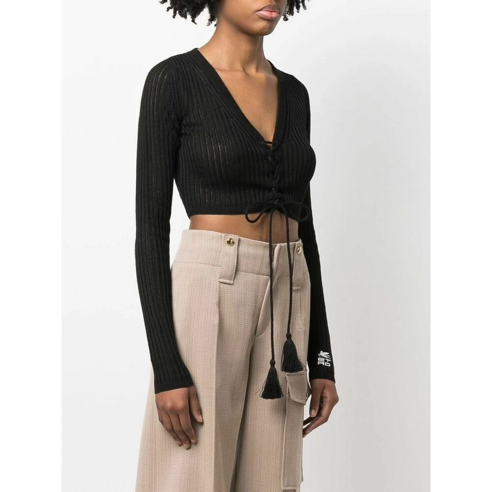 ETRO-gensere Svart svart Lin-silkeblanding beskåret ribbed-strikket topp fra ETRO med beskåret, ribbet strikket, brodert logo på hylsen, V-hals, front blonder-opp festing og lange ermer.