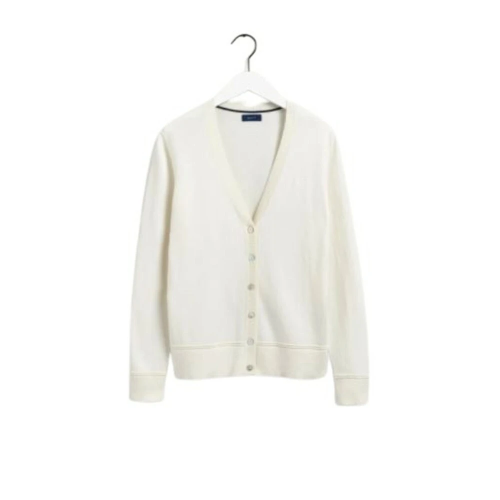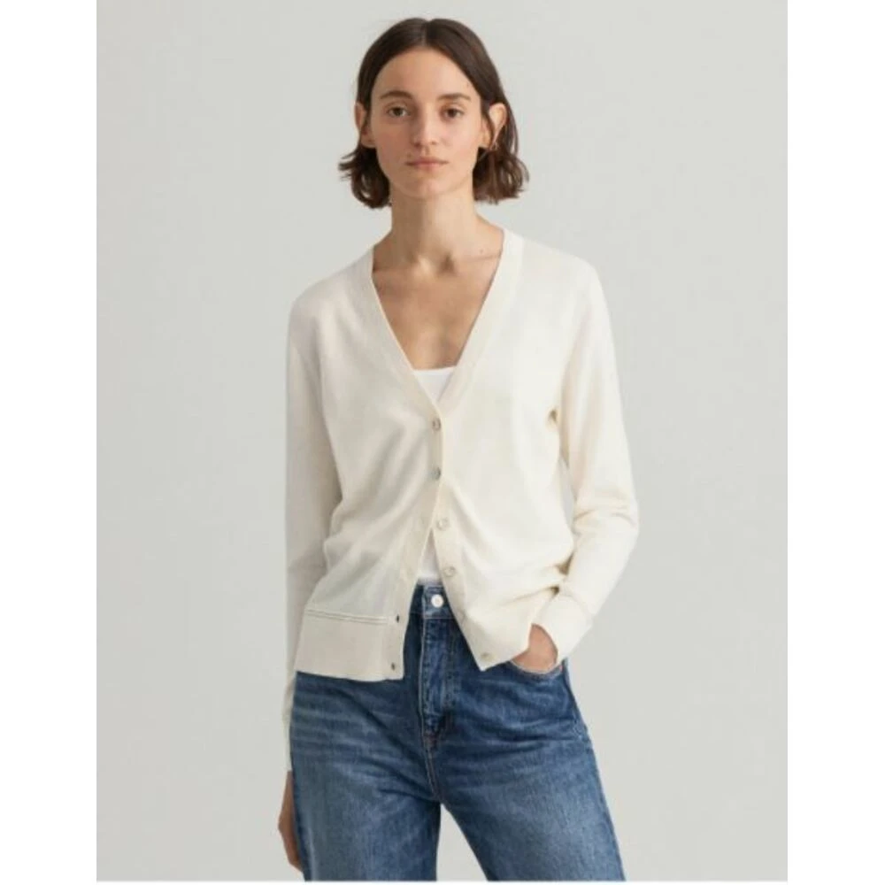 Navn: Gant Light cotton v-cardigan Farge : Eggehvit/ eggshell Beskrivelse: Hvit klassisk cardigan fra Gant Materiale: 100 % bomull