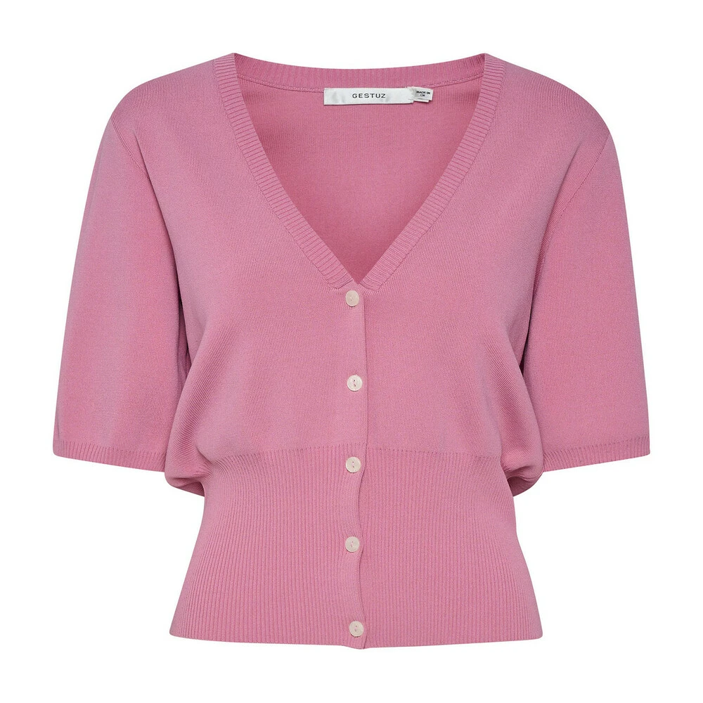 OBS! Fjernlager. Levering kan blive forlænget med 1-2 dage, hvis varen ikke findes i vores butik lige nu. Flot cardigan fra Gestuz med korte ærmer og v-hals. Cardiganen har en fin tætsiddende pasform omkring taljen men er lidt løsere omkring brystet, hvilket giver den en dejlig afslappet silhuet og udtryk. Den lukkes med knapper langs fronten. · Pasform: Alm · Model: Mattheagz Ss Rib Cardigan Strik 10906184 Wild Rose · Kvalitet: 65% viskose, 35% polyamid