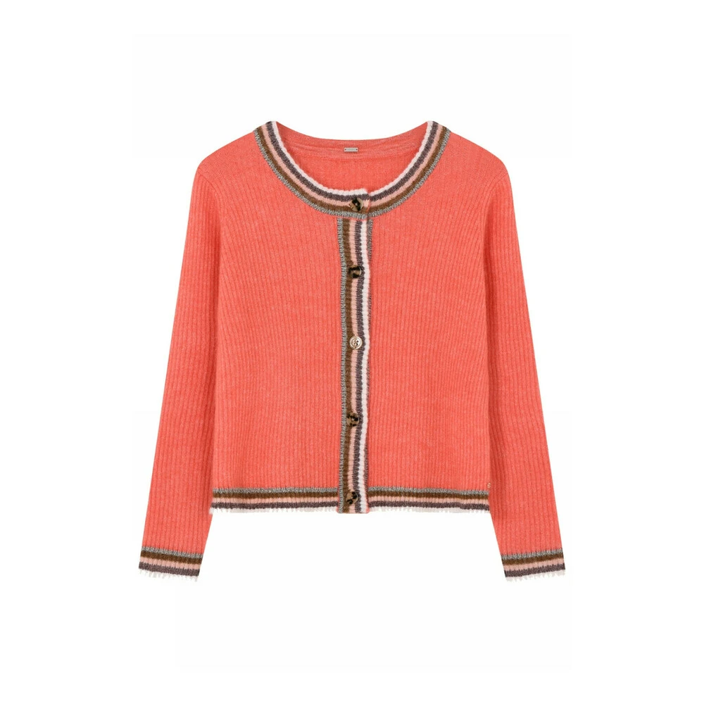 Super fin strikket cardigan fra Gustav med lange ermer og rund utringning med en fin flerfarget kant som går igjen rundt knappen, ermene og i bunnen. · Fit: ALM · Dimensjoner: Str. S: Brystdimensjoner: 50 cm. x 2. Lengde: 55 cm. · Modell: Magda, strikket cardigan strikk 46408/3713 oransje rose · Kvalitet: 28% polyester, 21% akryl, 19% mohair, 19% ull, 10% Lurex, 3% Elasthan · Vask: 30 grader ekstra ekstra vask