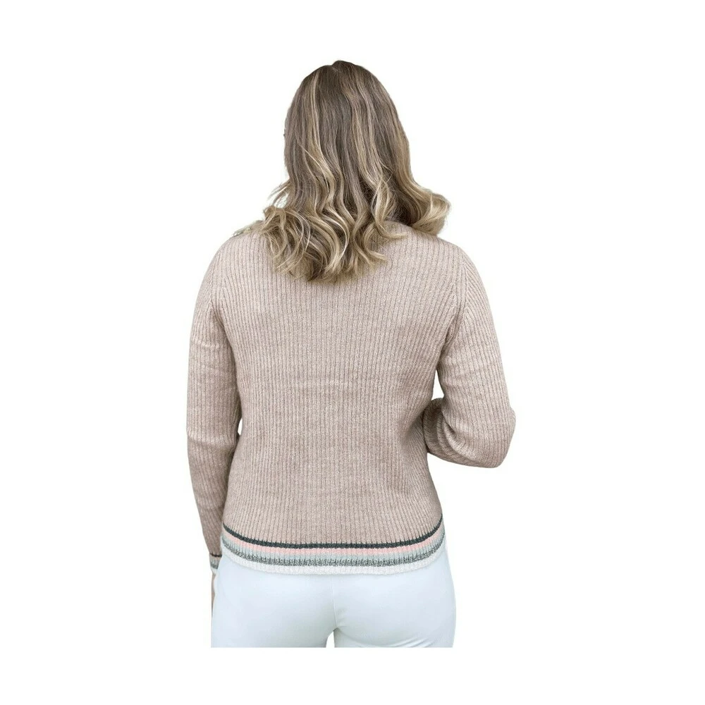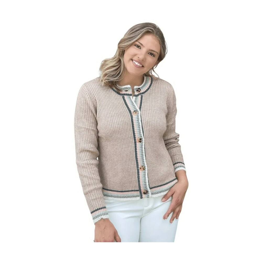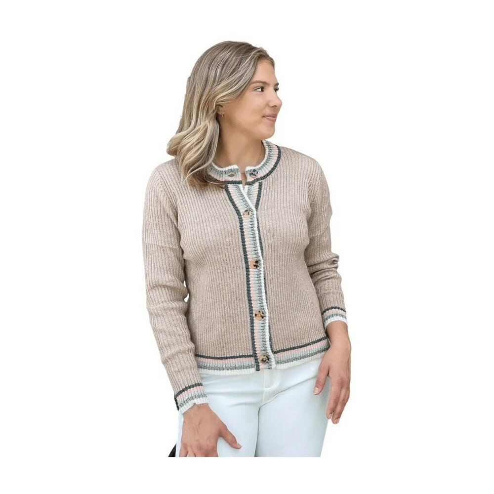 Magda er en flott ribbestrikket cardigan med søte detaljer. Den har rund hals, kneppestolpe foran og kommer i en avslappet fasong. Strikkejakken har flerfargede striper med lurexdetaljer rundt hals, kneppestolpe, ermer og nedrekant. Den er myk og tynnstrikket -og kan fint brukes som en genser når den er lukket. Normal i størrelsen.