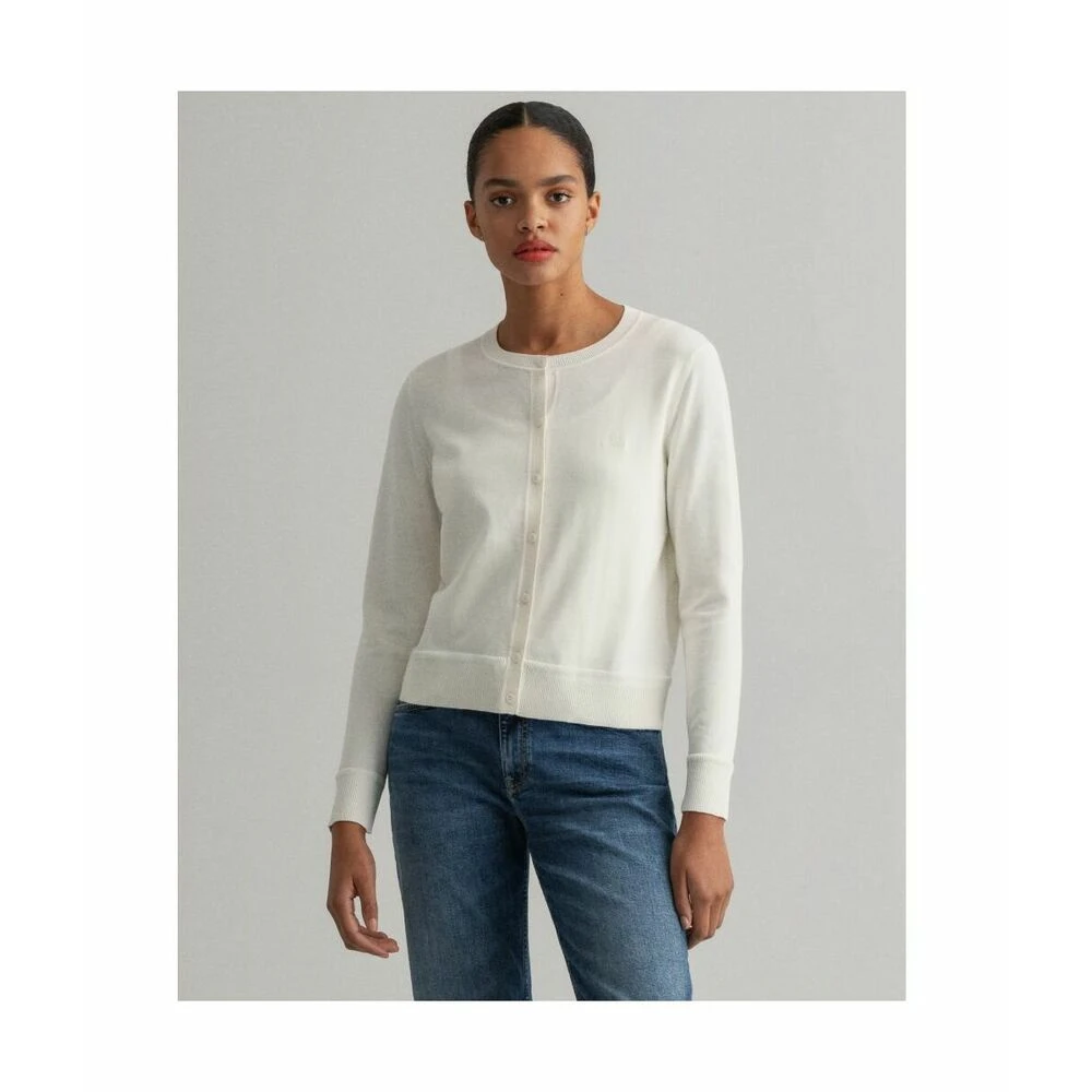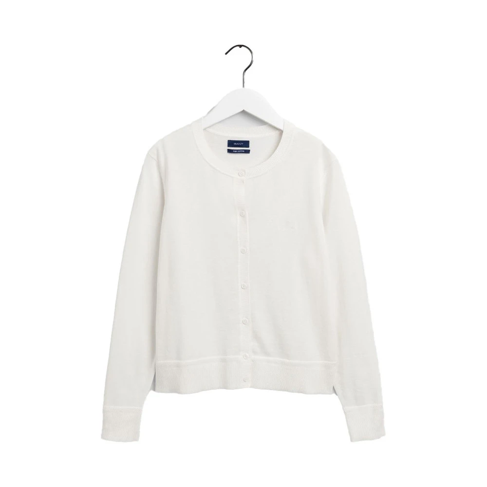 Hvit cardigan fra Gant, med rund hals og knappestolpe med hvite knapper. Ribbestrikkede kanter. Monofarget logo på brystet. Rett passform og normal i størrelsen. Inneholder: 100; Bomull.