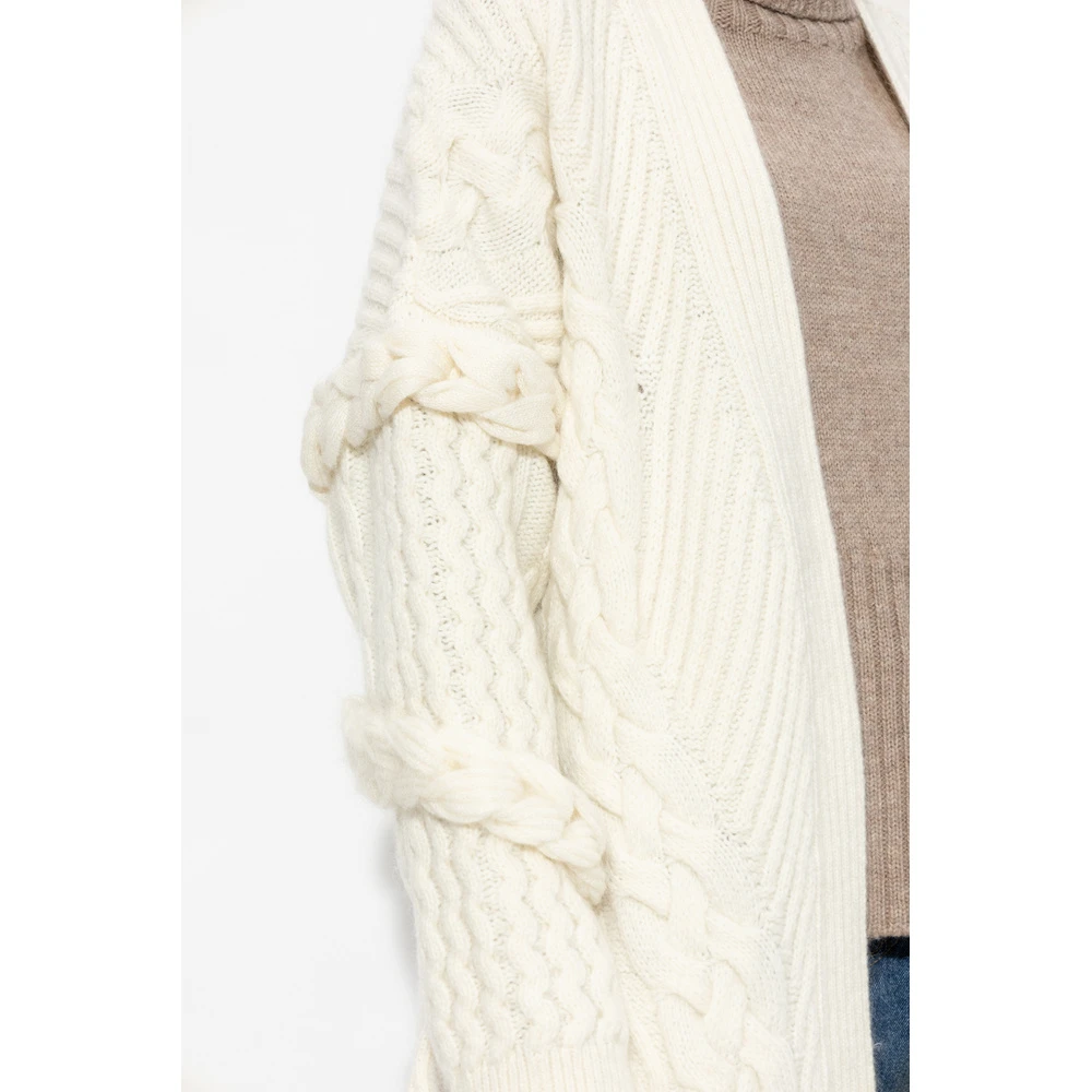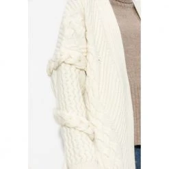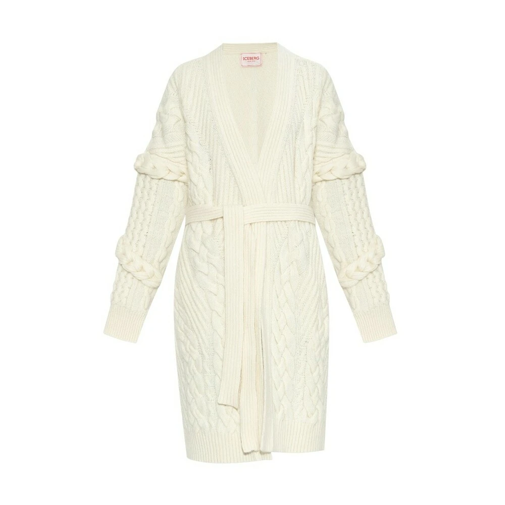 Kremkardift fra Iceberg. Denne stilen er laget av en ull- og mohairblanding, og har et midje-hinkende binding, to glidelommer, dekorative sømopplysninger og lange ermer.