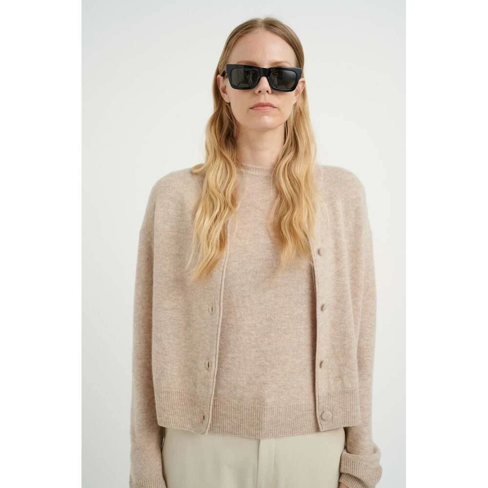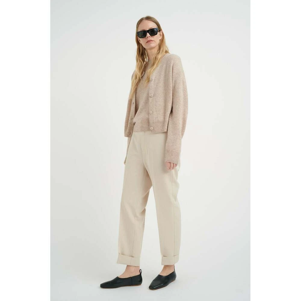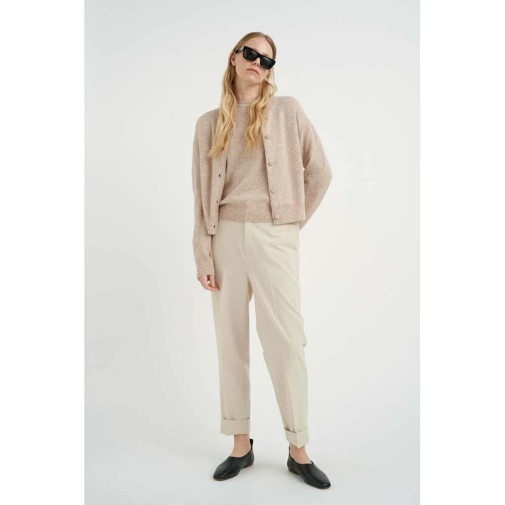 MonikaIW Cardigan fra InWear. Nydelig cardigan fra InWear i en myk og luksurøs ull- og kasjmirmiks som varmer godt på kalde dager. MonikaIW Cardigan har lange ermer med lav skuldersøm og en flatterende og feminin hoftelengde, som gjør cardiganen ideell å kombinere med dressbukser. Cardiganen har knappelukking i front, rund hals og ribbestrikkede mansjetter og fald. Den vakre lyse beigefargen er kledelig til alle, og gjør at cardiganen fungerer like godt i vinterhalvåret som på våren. Materiale: 90% ull, 10% kasjmir Om merket: InWear er et dansk merke som ble grunnlagt av Niels Martinsen i 1969. Helt fra start har merkets filosofi vært å skape en garderobe av plagg som gir kvinner frihet, komfort og en følelse av selvtillit. InWears skreddersøm er bygget rundt moderne minimalisme og de har stor tro på langvarige løsninger. For å sikre plagg som holder lenge gransker de hver eneste detalj før designene settes i produksjon. Den gode kvaliteten kombinert med en vellykket kombinasjon av urbanitet og femininitet har sørget for at merket er like aktuelle i dag, som de var for 50 år siden.