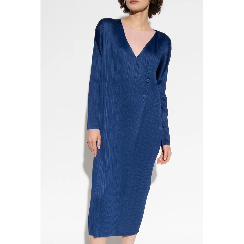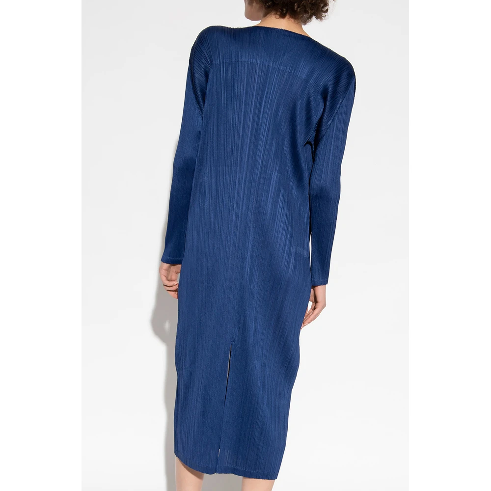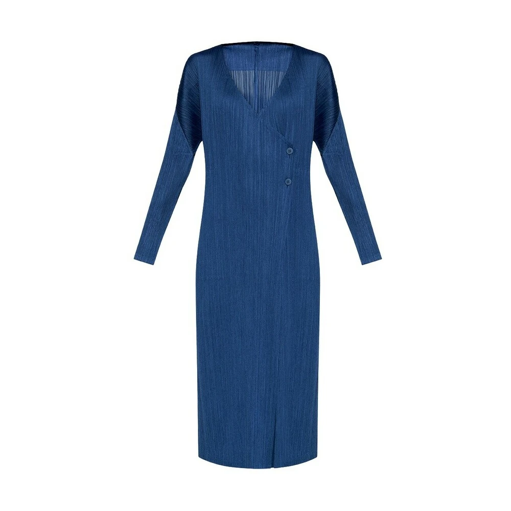 Navy Blue Cardigan fra Issey Miyake Pleats takk. Denne stilen utmerket med pliss, og har en dobbeltbrystet knappfesting, en V-lerlin, lange ermer, to lommer på fronten og en enkelt ventilasjon bak.