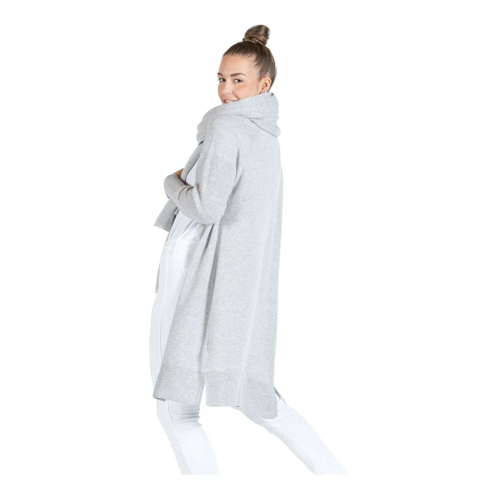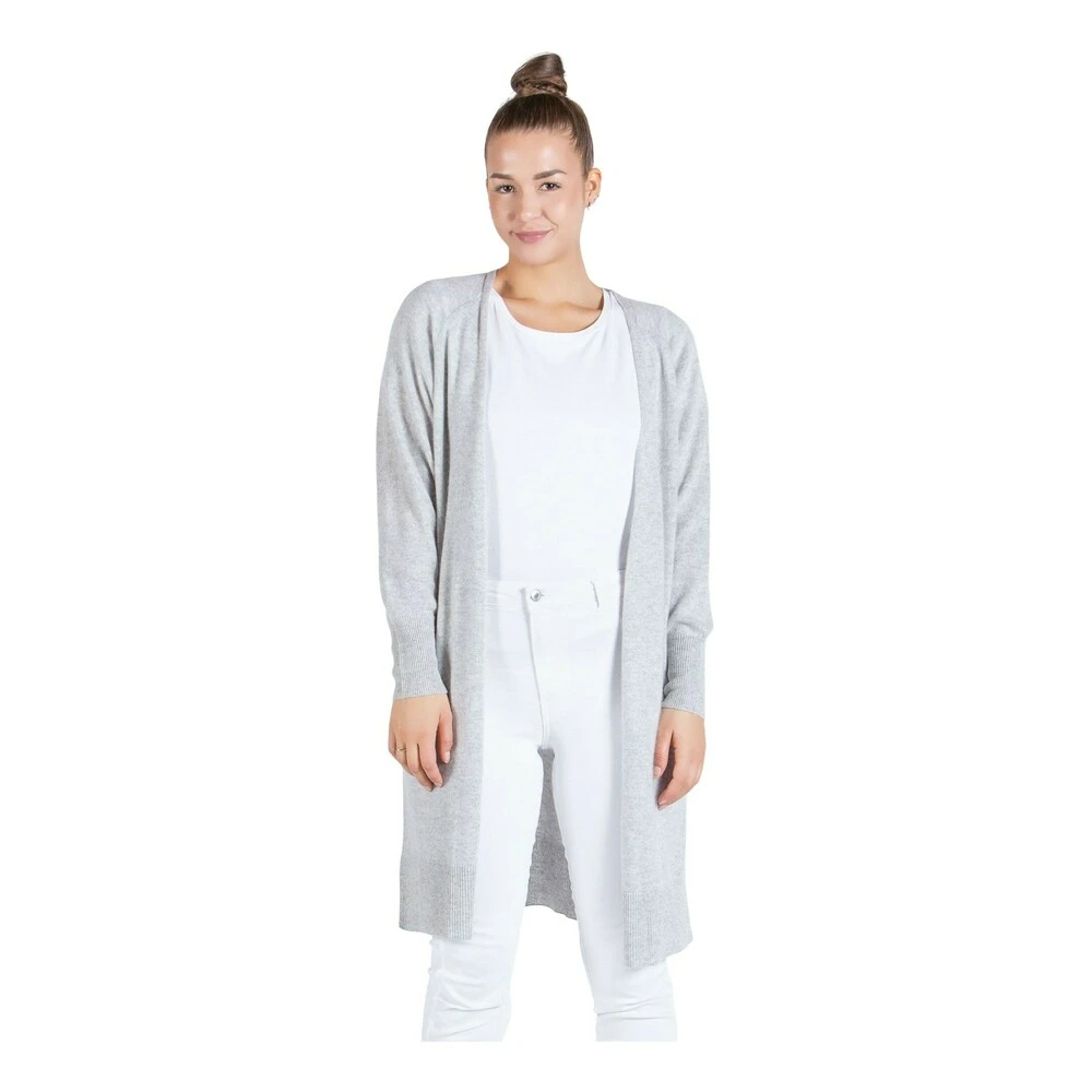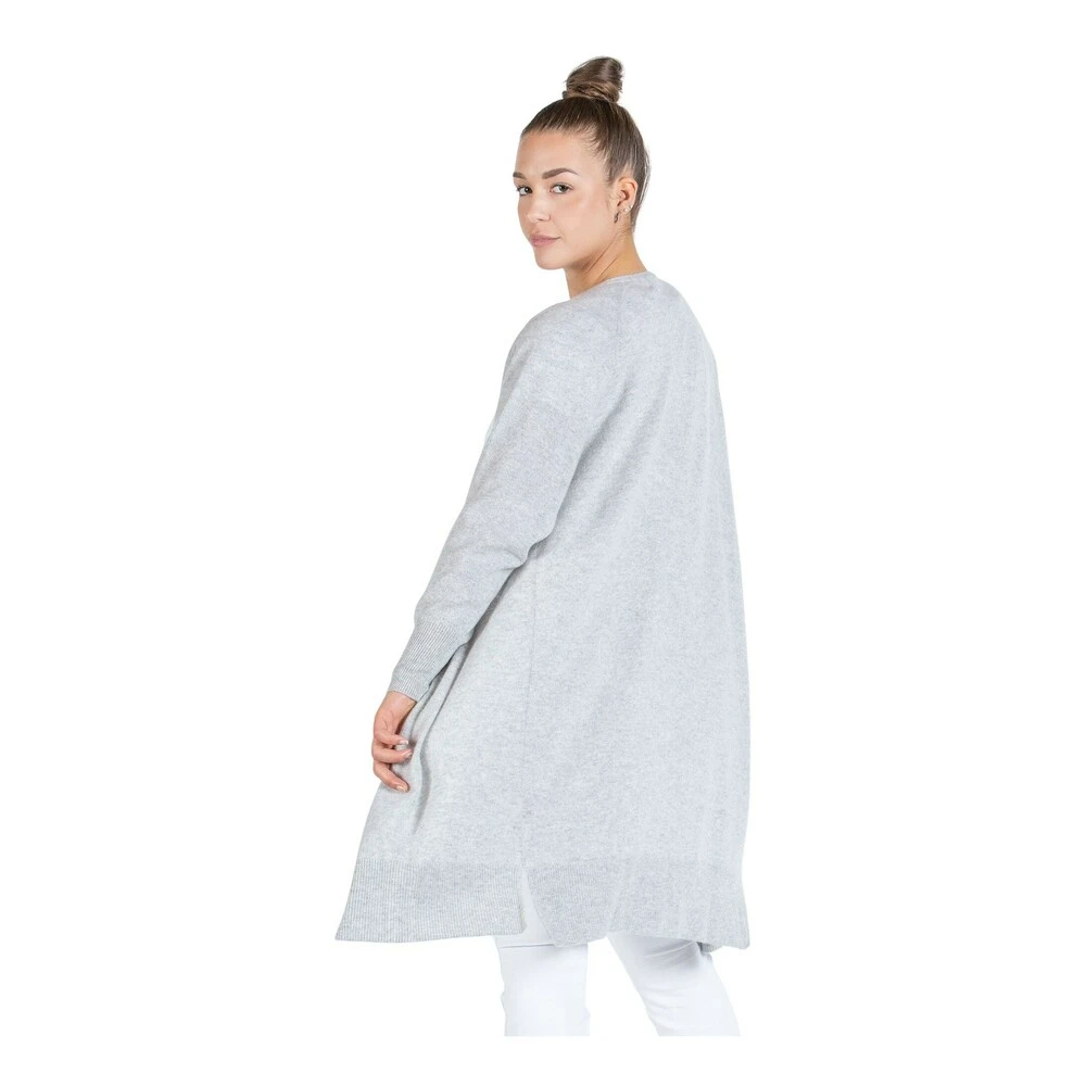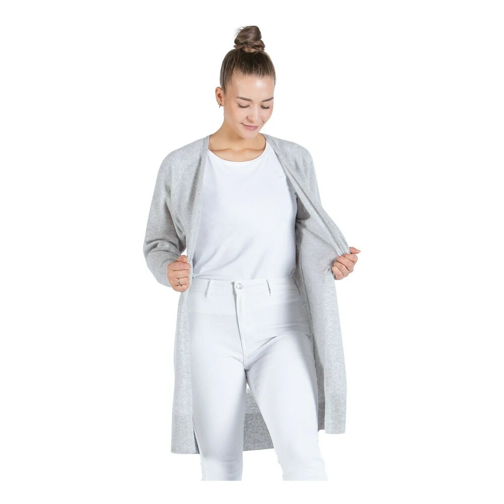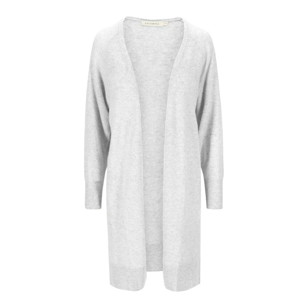 Kashmircardigan Flow Knee Flow knee er oppfølgeren til vår populære og florlette Flow lang cardigan. Flow knee er litt tettere i strikken, og kortere på lengden. Den går ned til kneet. Ellers er designet likt, med sofistikerte ribbstrikkdetaljer på avslutninger på lengden og på ermer. Enkel og moderne silhuett. Cardiganen er strikket i 100% kashmir, i tykkelse 9 gauge. Lett og luftig strikk i myk og behagelig kvalitet. Modellen er 174 cm og har på seg str S