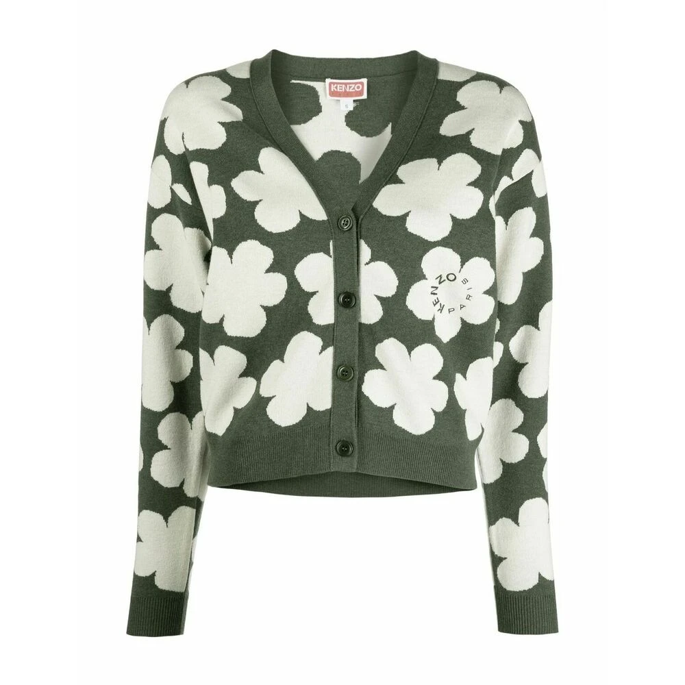 Kenzo grønn/hvit maglie cardigan grønn farge. Lange ermer, Halsning V. Lukker med synlige frontknapper. Blomsterinnlegg fargekontrast til over. Logo Kenzo Paris Frontale
