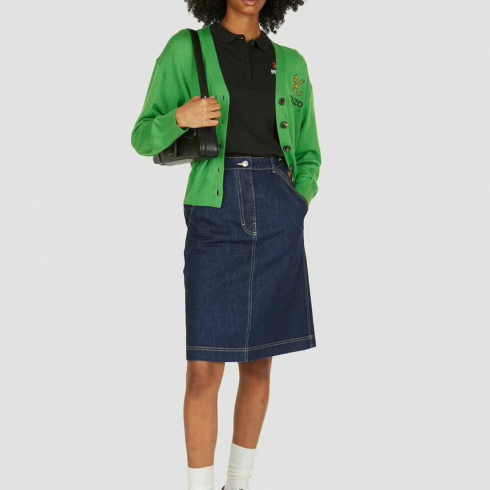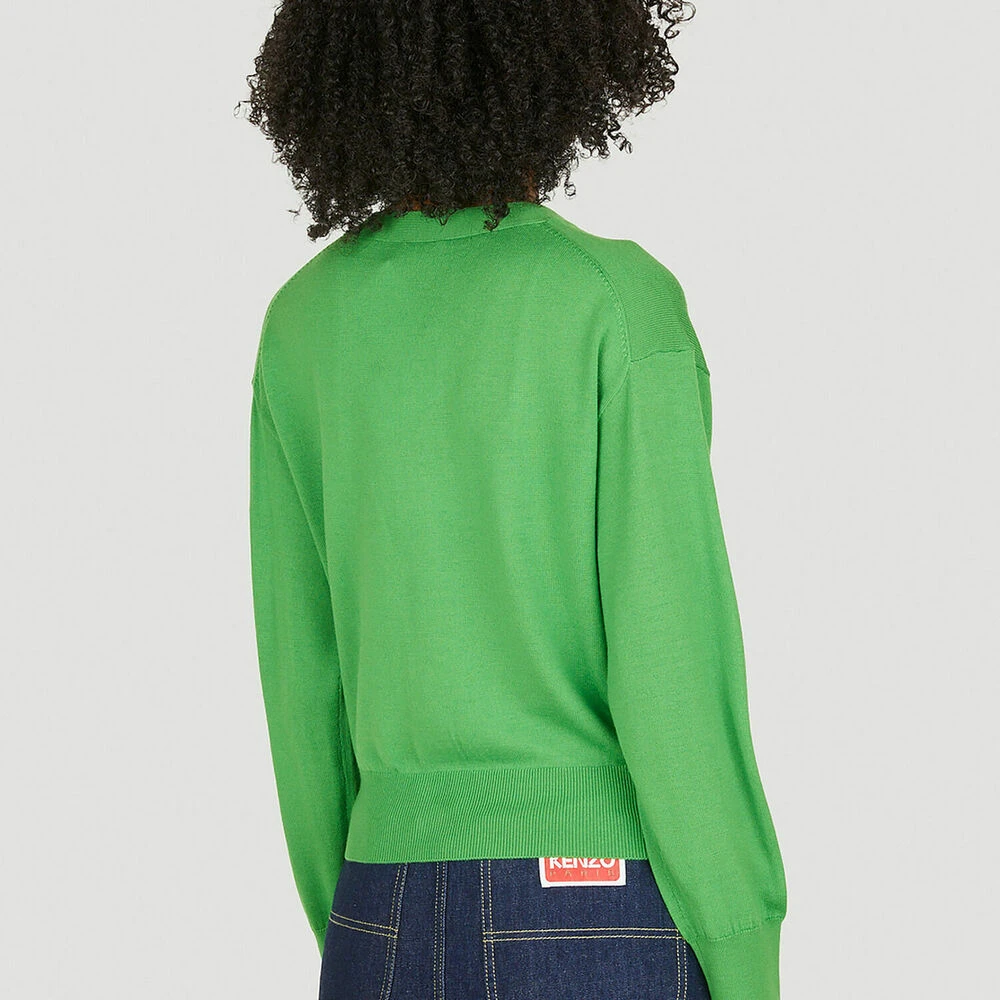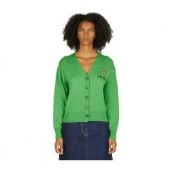 DJ Nigo hedrer Kenzo`s Legacy, sammenslåing av Metropolitan Streetwear med ikoniske grafiske utskrifter fra den store historien til det franske huset. Logo-broderi-cardigan er laget av ull i en strikket vev, med en V-hals, frontknappfesting, lange ermer og brystlogo broderi. Vår i en strikk