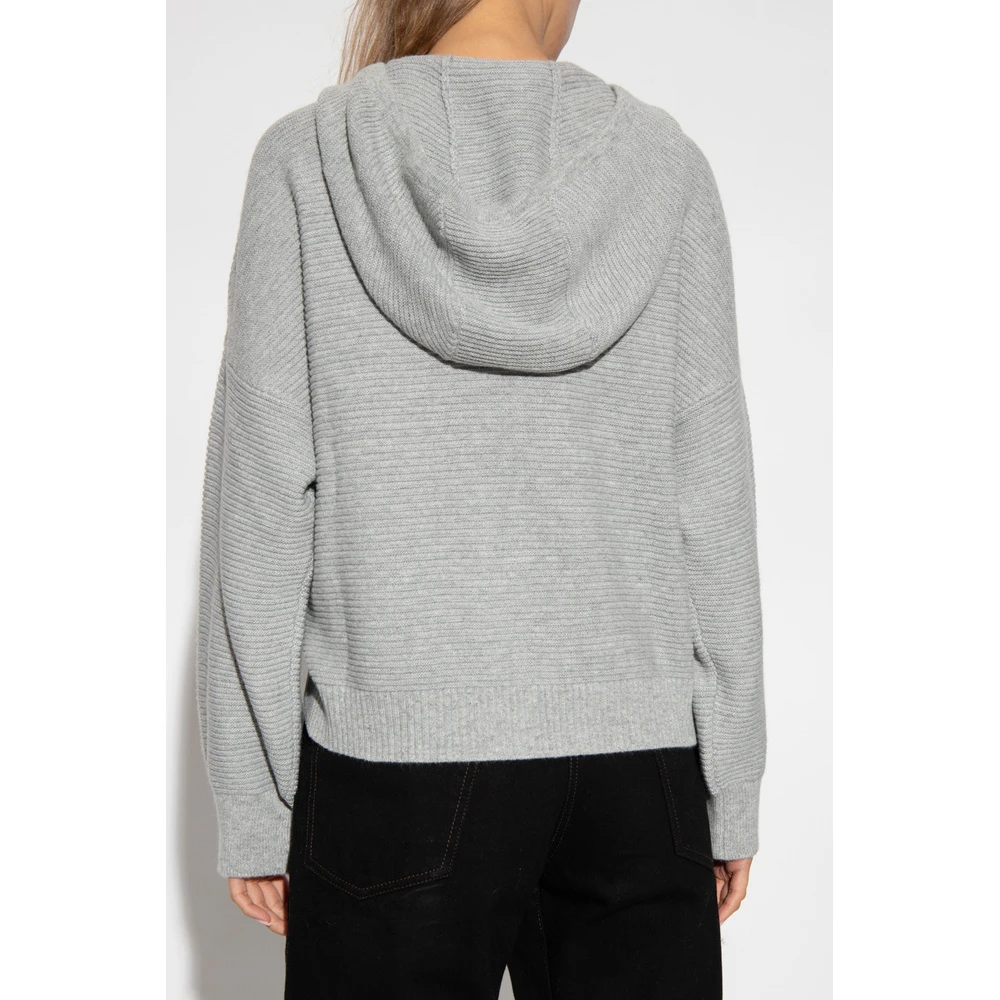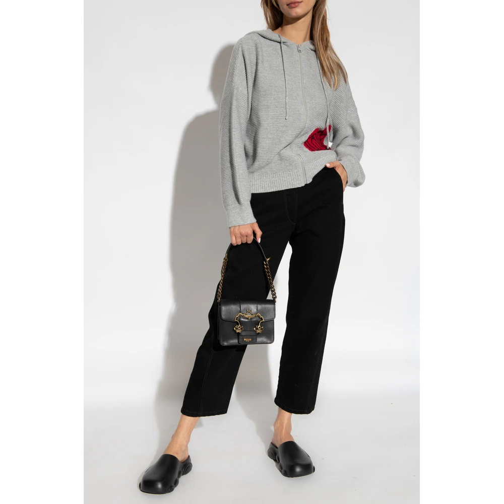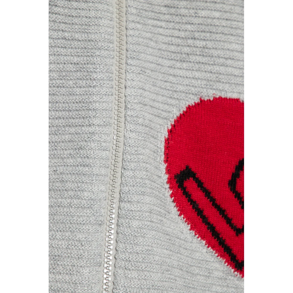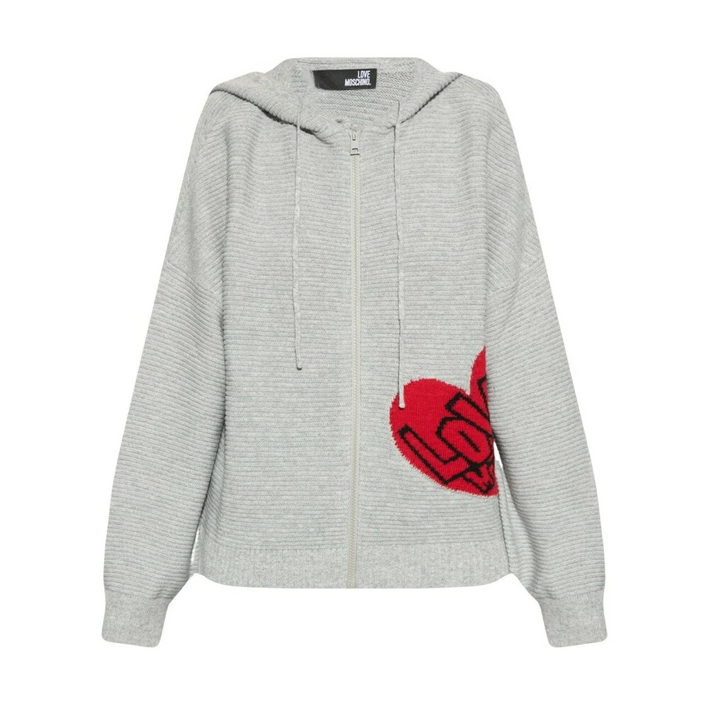 Lysegrå løs passende cardigan fra Love Moschino. Dette plagget er festet med glidelås, og har en trekkhette, rød og svart logo -broderi, hjertemotiv og lange ermer.