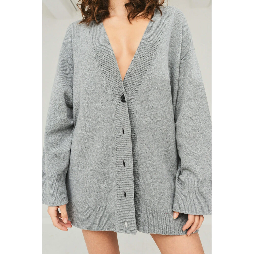 The Molina oversized cardigan features five buttons in the front and has a deep v-neck. The oversized silhouette creates a simple and classic look and is easy to dress up and down – style it with our Molina Elastic Shorts to complete the outfit. Color / Grey Melange Outer / 80% Wool, 20% Recycled Nylon Details / Oversized knit cardigan with deep v-neck and feature contrast buttons Fit / This style has an oversized fit Model size / Mikkeline is 174 cm tall and wearing size One Size Climate / 25,52 kg of CO2 has been balanced out for this style Garment maker / Huizhou City De Qin Knitting Co., Ltd., China Fabric maker / UPW, Hong Kong Care / Hand Wash