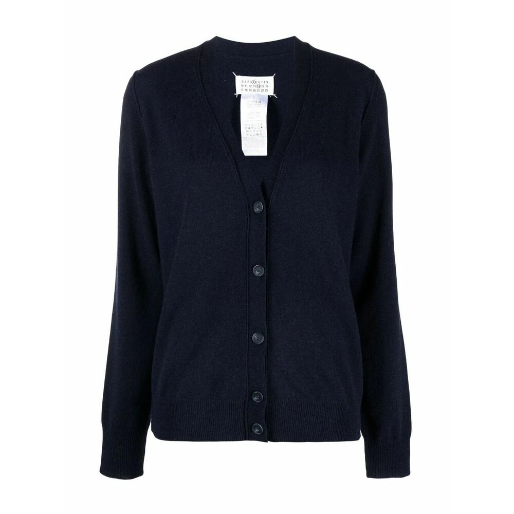 Maison Margiela Gensere Blue V-hals Cashmere Cardigan fra Maison Margiela med marineblå, kashmir, fin strikk, V-hals, frontknappfeste, lange ermer og rett hem.