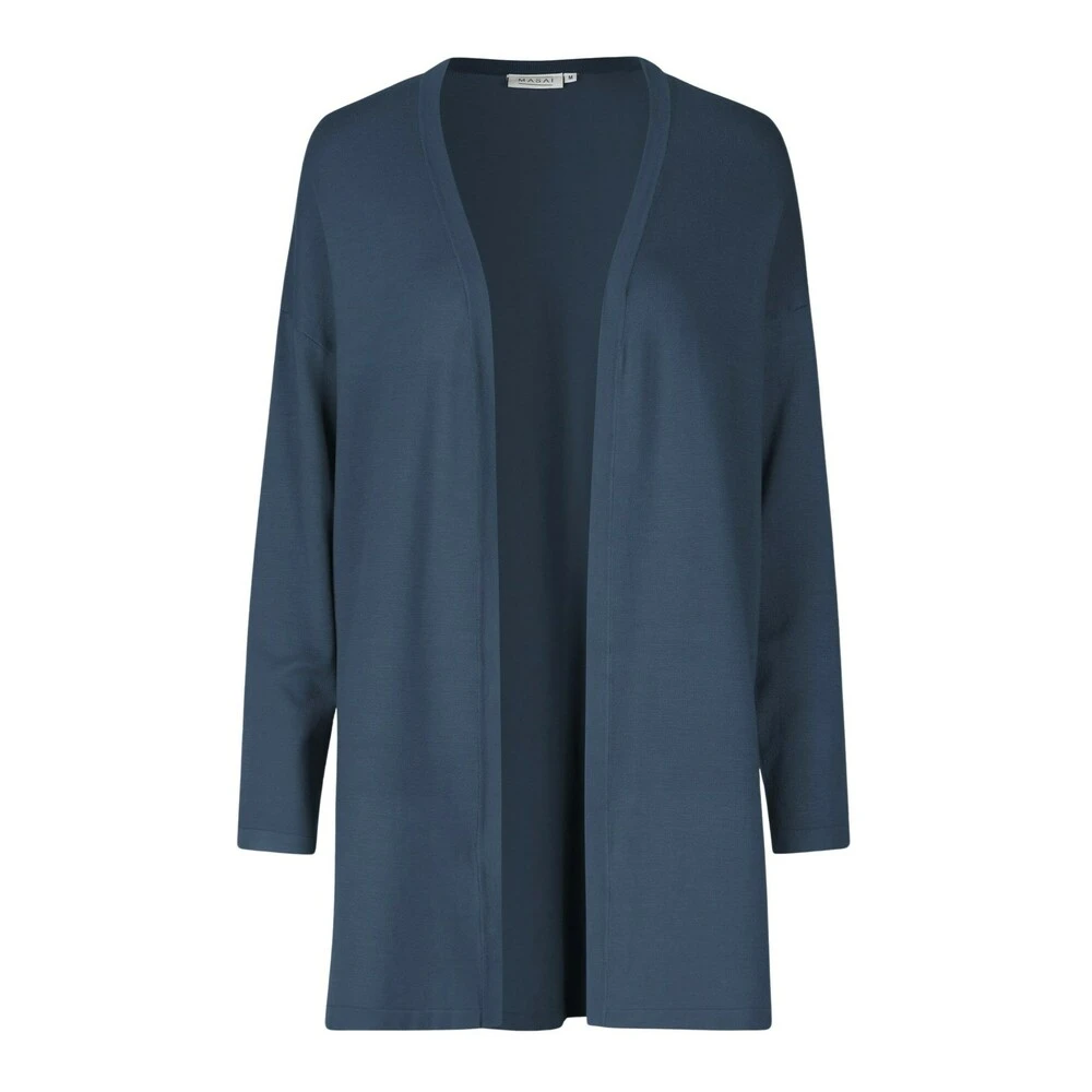 Deilig åpen kofta fra Masai med lange ermer, smale kanter og en fin myk kvalitet. · Fit: Løs -montering · Dimensjoner: Str. S: Brystmål: 53 cm. x 2. Lengde: 90 cm. · Modell: Lon Cardigans 1004047 Sargasso Sea · Kvalitet: 82% viskose, 15% polyamid, 3% Elasthan · Vask: 30 grader Skåne Wash