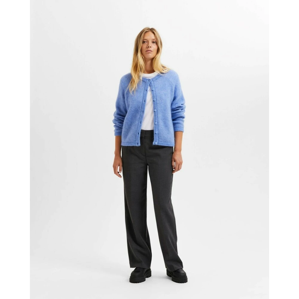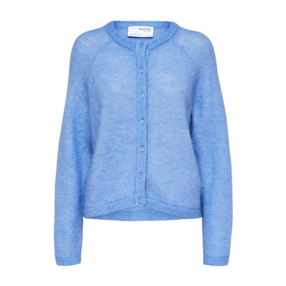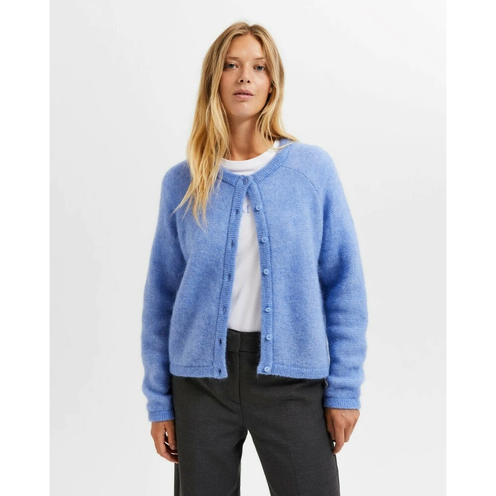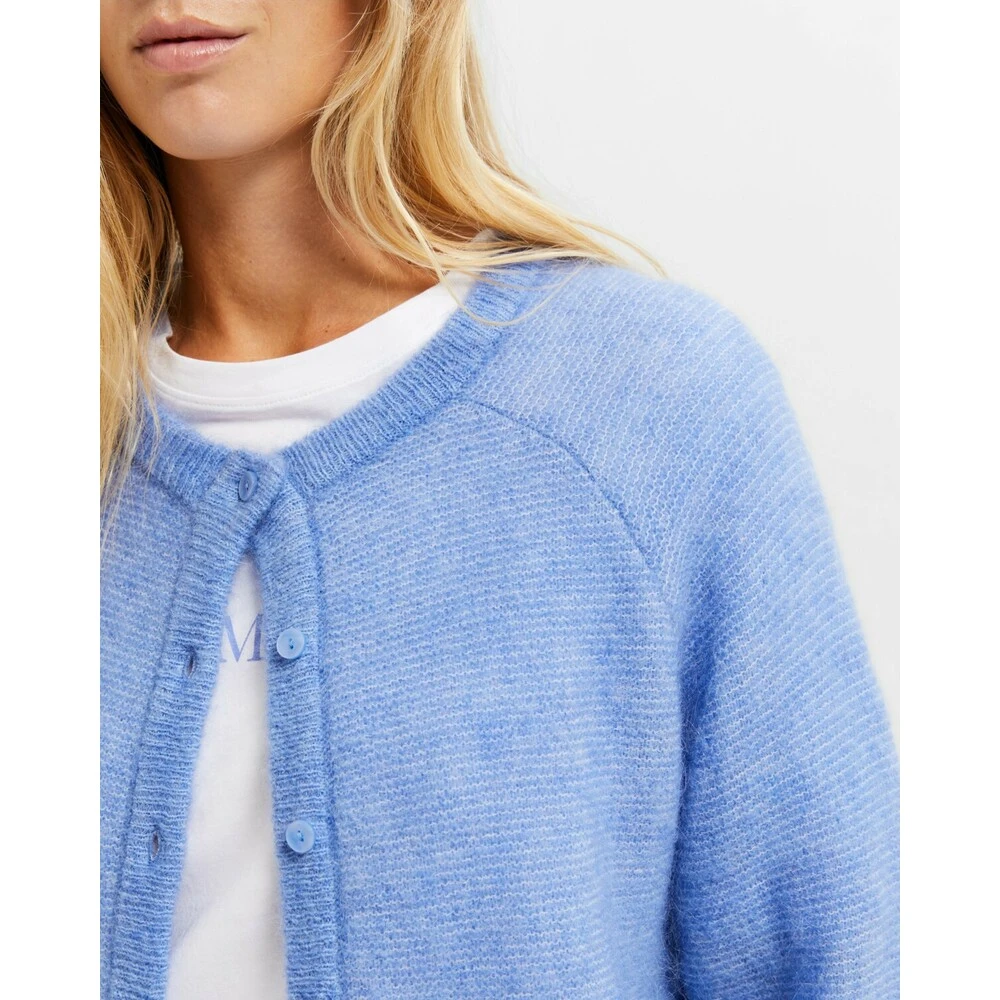 Myk og deilig strikket cardigan i fantastisk blåfarge. Farge: Cornflower Blue Materiale: 43% Wool – RWS, 30% Mohair – Responsible Mohair Standard, 23% Nylon, 4% Elastane