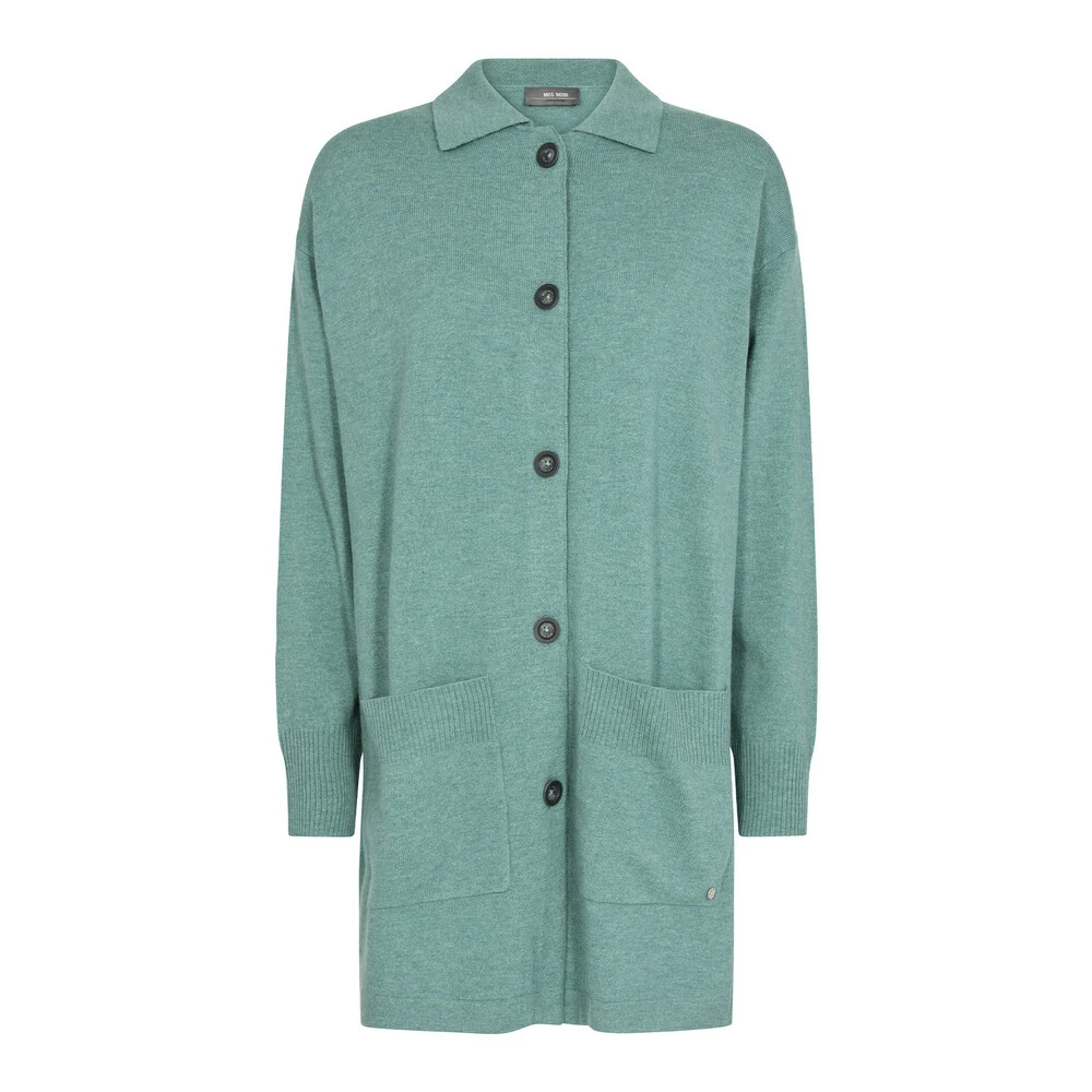 MERK! Ekstern lagring. Levering kan forlenges med 1-2 dager hvis varen ikke finnes i butikken vår akkurat nå. En strikket cardigan fra Mosh Mosh laget av en myk ull. Cardiganen har en avslappet silhuett og en klassisk krage i halsen, den har knappavslutning langs fronten og romslige lommer. Par det mulig. med et par mørkeblå eller svarte jeans. · Fit: Lett løs -Fitting · Modell: Elvo strikket kofte strikk 145300 blå gran · Kvalitet: 100% ull
