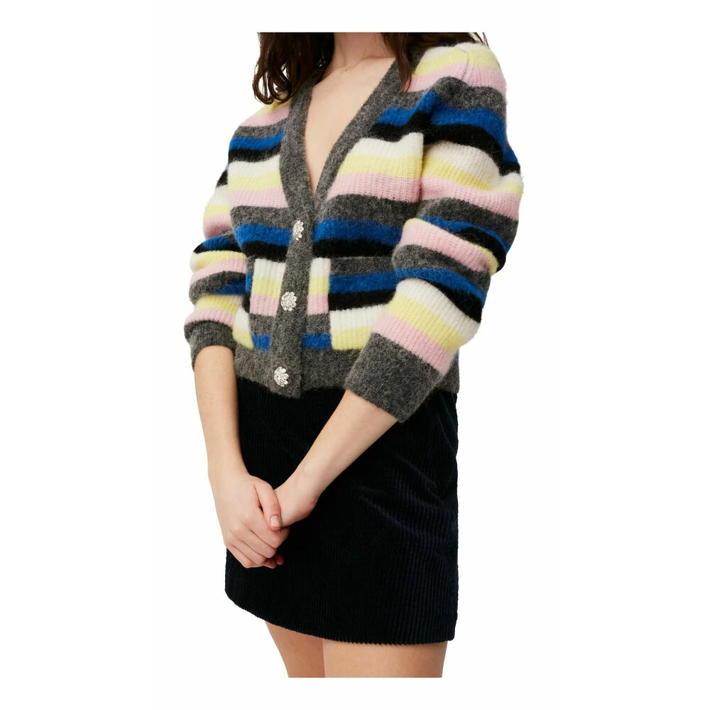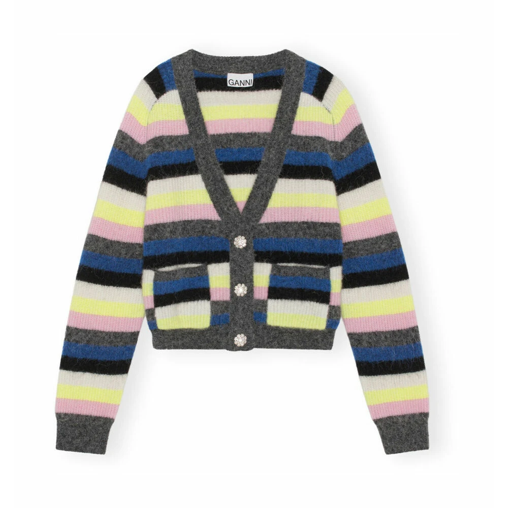 Stripe Wool Cardigan fra Ganni er designet for en avslappet passform og har v-hals, frontlommer og pyntede knapper. Materiale: 32 % alpaca, 32 % merino, 30 % polyamide, 6 % elastane Farge: Nautical blue