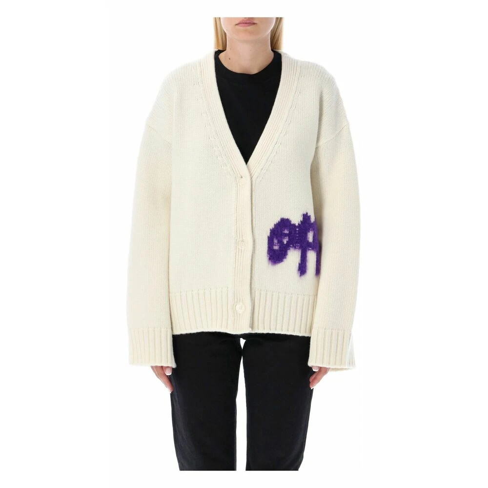 Kremkardift fra off-white. Dette plagget er laget av ull, og har en lilla logo -broderi, lange ermer og ribbestrikkede trimmer ved hemmen og mansjettene.