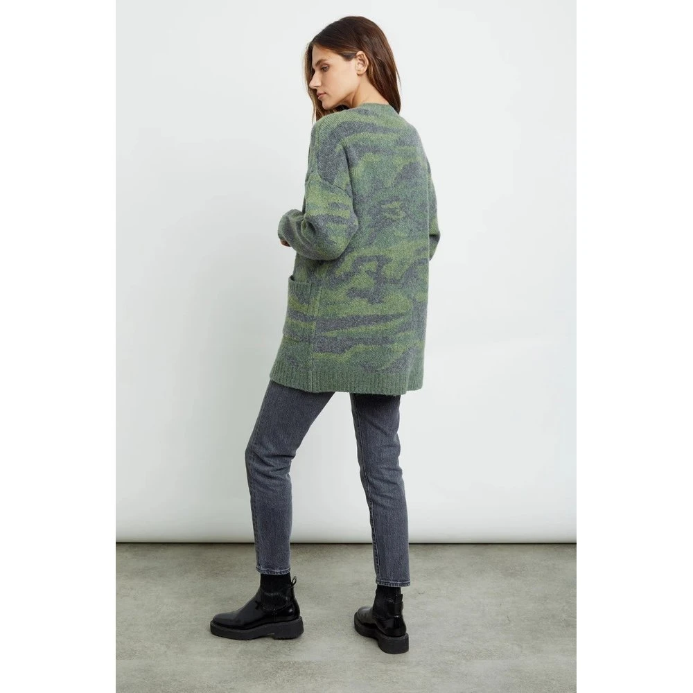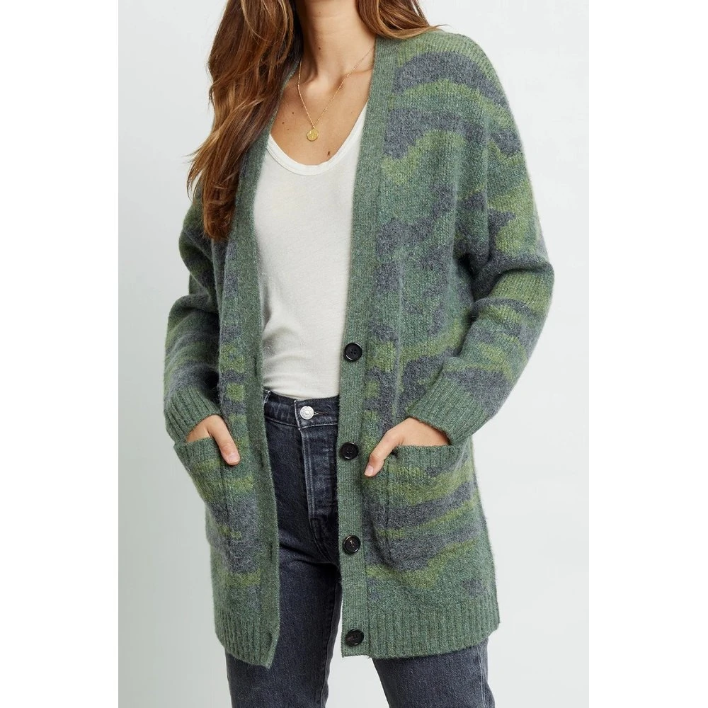 Produktdetaljer: Supermyk langermet cardigan med en alpakka-blanding. Denne cardiganen har en dyp v-hals med v-hals som gjør den passelig våde med skjorte og med tynne gensere under. Det grønne kamuflasjemønsteret gjør at den passer med det meste av farger.
