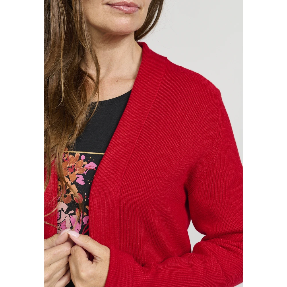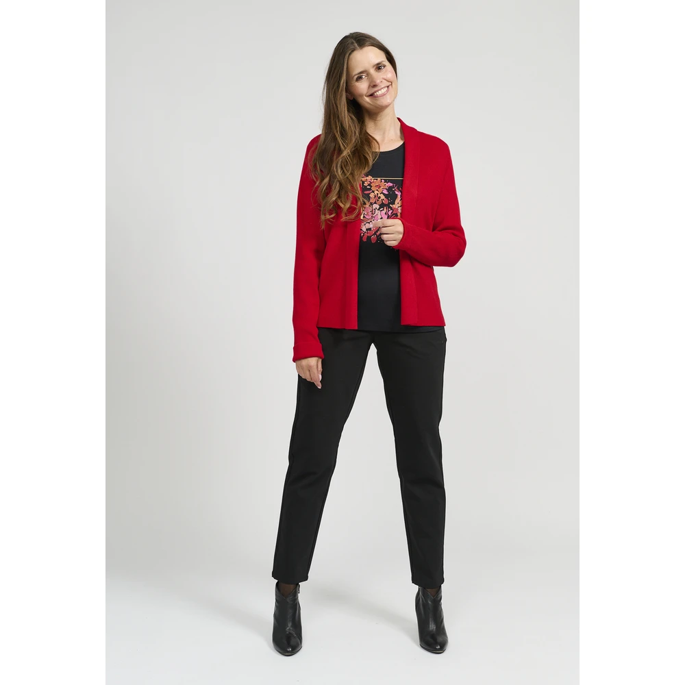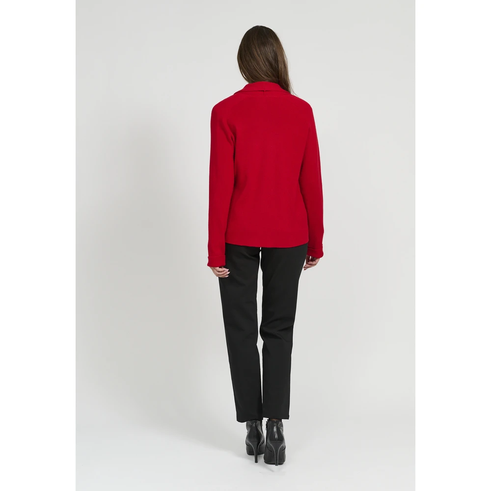 Rød cardigan med krage fra Signature Lengde str M: ca 62cm Innhold: 80% Viscose, 15% polyamid og 5% elastan. Vask: 30 grader