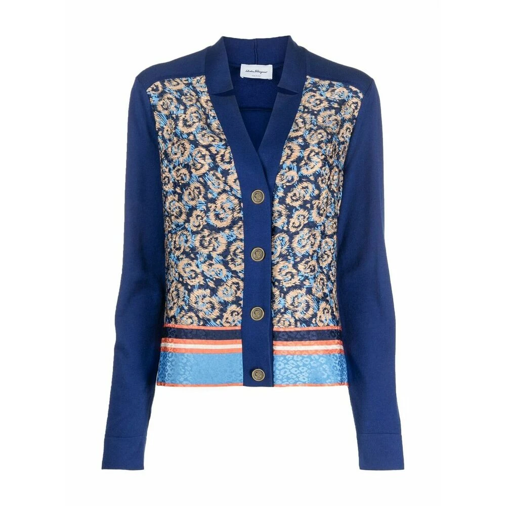 Salvatore Ferragamo Gensere Blå bomullssilk Blending Abstract-Leopard Print Cardigan fra Salvatore Ferragamo med marineblå, blå, brent oransje, all-over leopardtrykk, hakkede lapeller, frontknappfesting, lange ermer og rett hem.