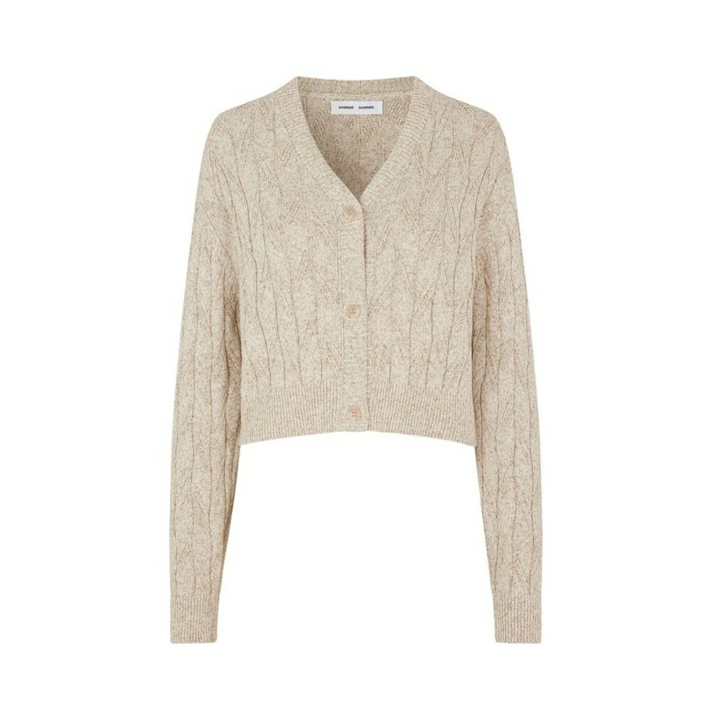 Lou Cardigan 14287 fra Samsøe ; Samsøe. Relaxed-fit cardigan med v-hals, kort lengde og senket skuldre. Knappefeste. Kabelsømmønster og ribbekanter. Normal i størrelsen. Materiale: 100% Bomull.