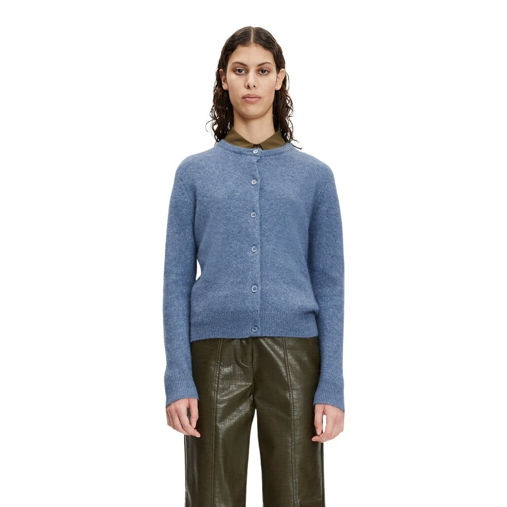 Denne kofta med lange ermer ble strikket fra myk og fluffy alpakka og merino -blanding. Knappens lukking på fronten og de vakre ribbenene gjør dette kofta ideell for kjøligere dager.