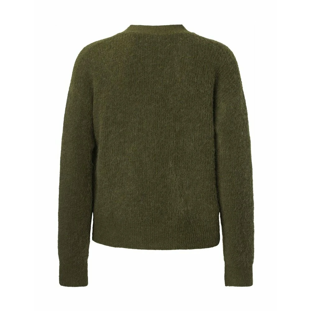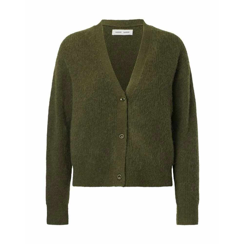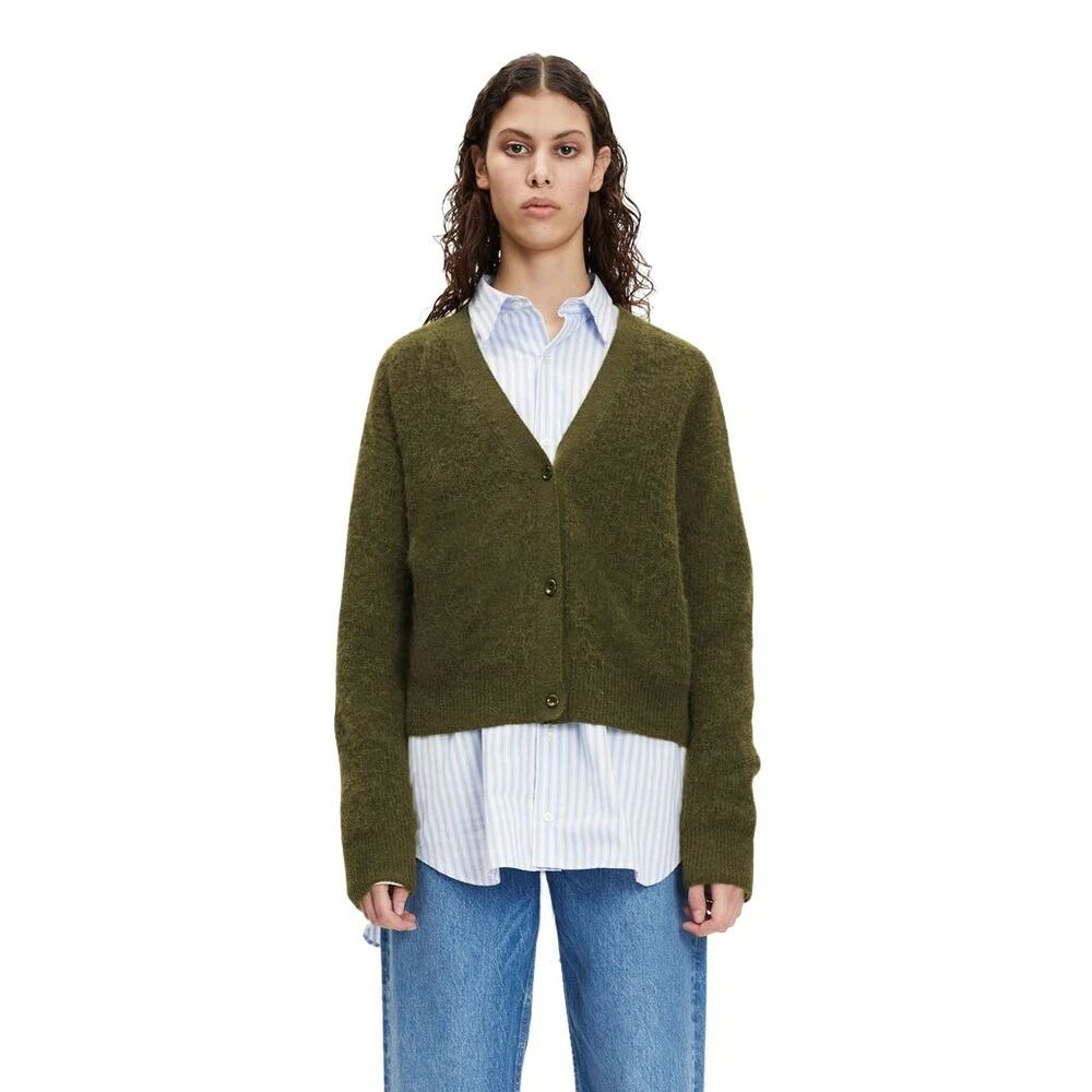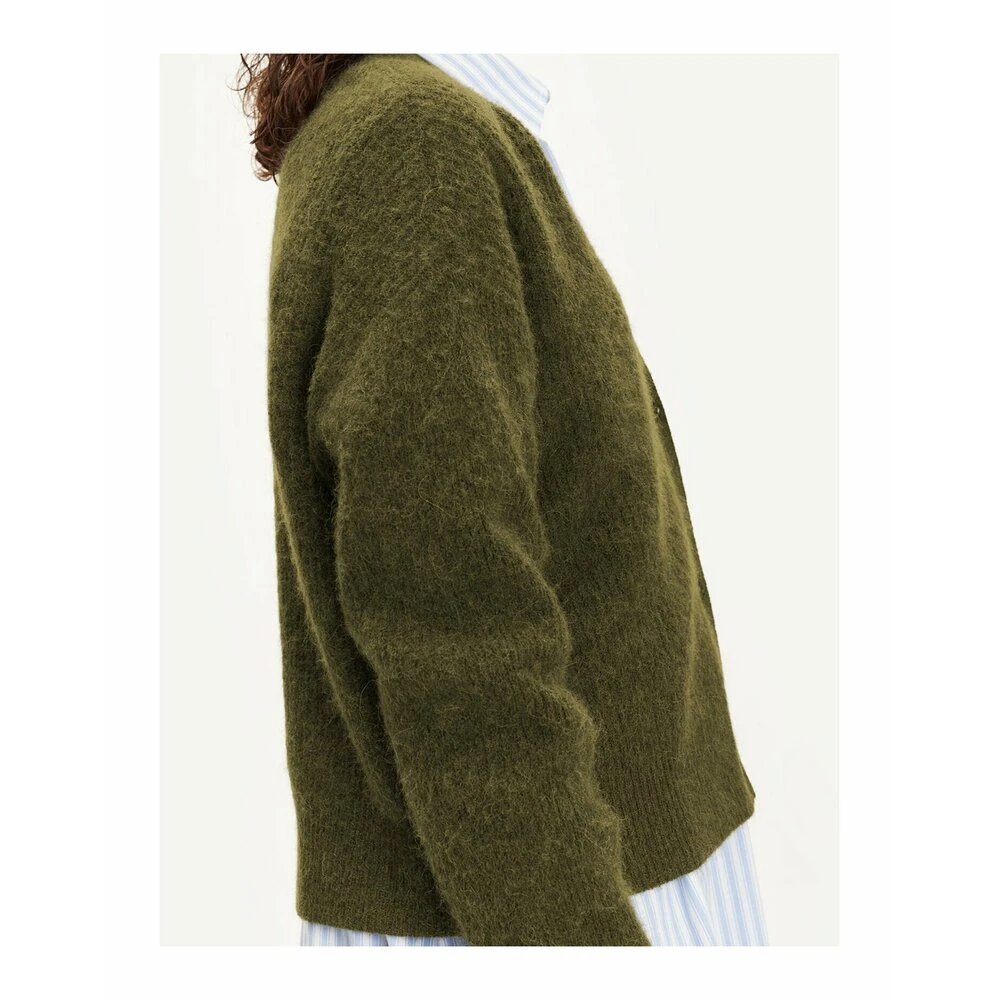 Cardigan sitter cardigan med v-hals. Lukking med tre knapper. Ribbet struktur. Farget melange garn blandet med resirkulert polyester, merinoull og fluffy alpaca.