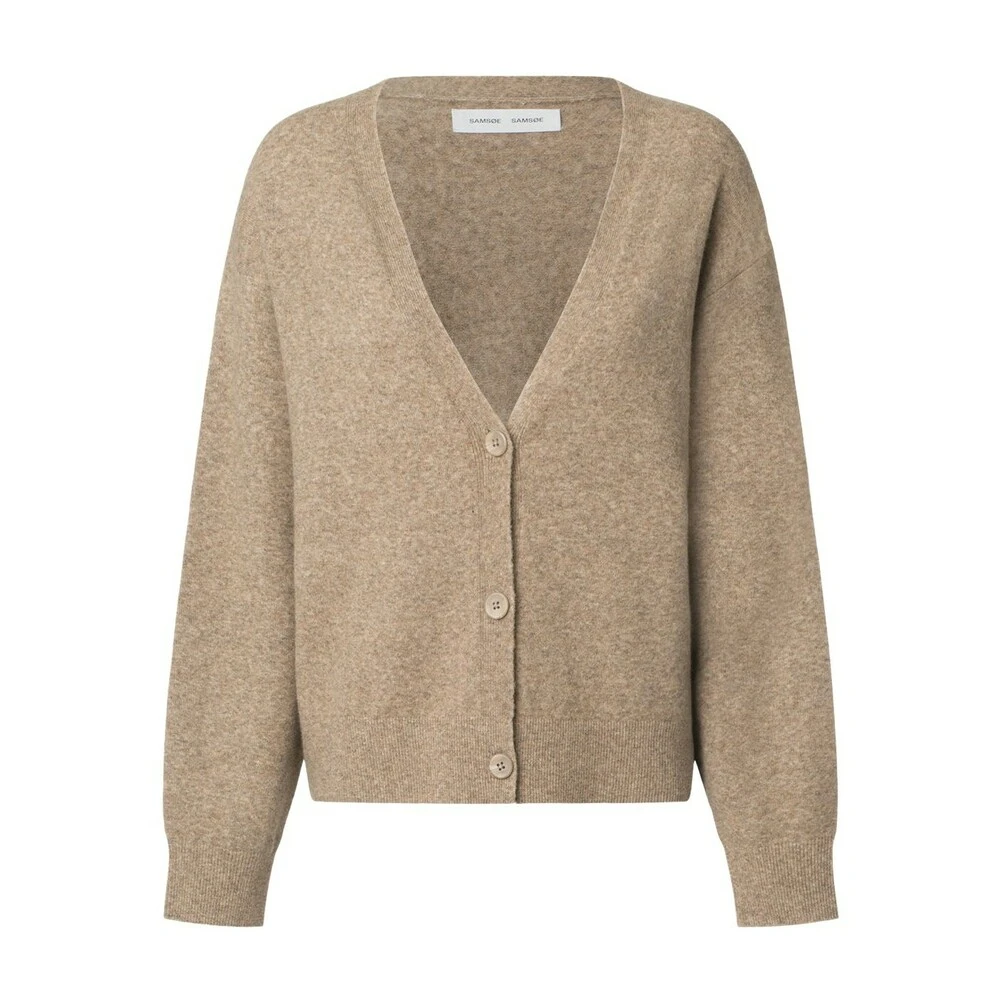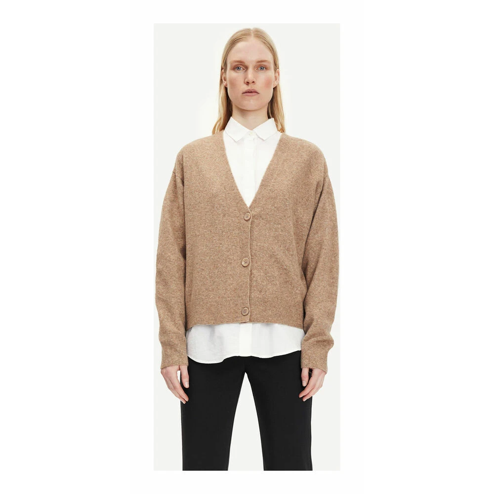 Frances cardigan fra Samsøe Samsøe. En avslappet cardigan med V-hals. Ribbestrikkede mansjetter og nederkant. Fint målgarn, RWS -sertifisert ull, yak og resirkulert polyamidblanding. Modellen er 176 cm høy og har på seg størrelse small. Normal i størrelsen. Laget av 60% ull, 27% Polyamide, 10% Yak og 3% Elastane.
