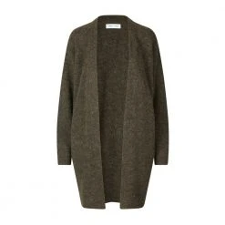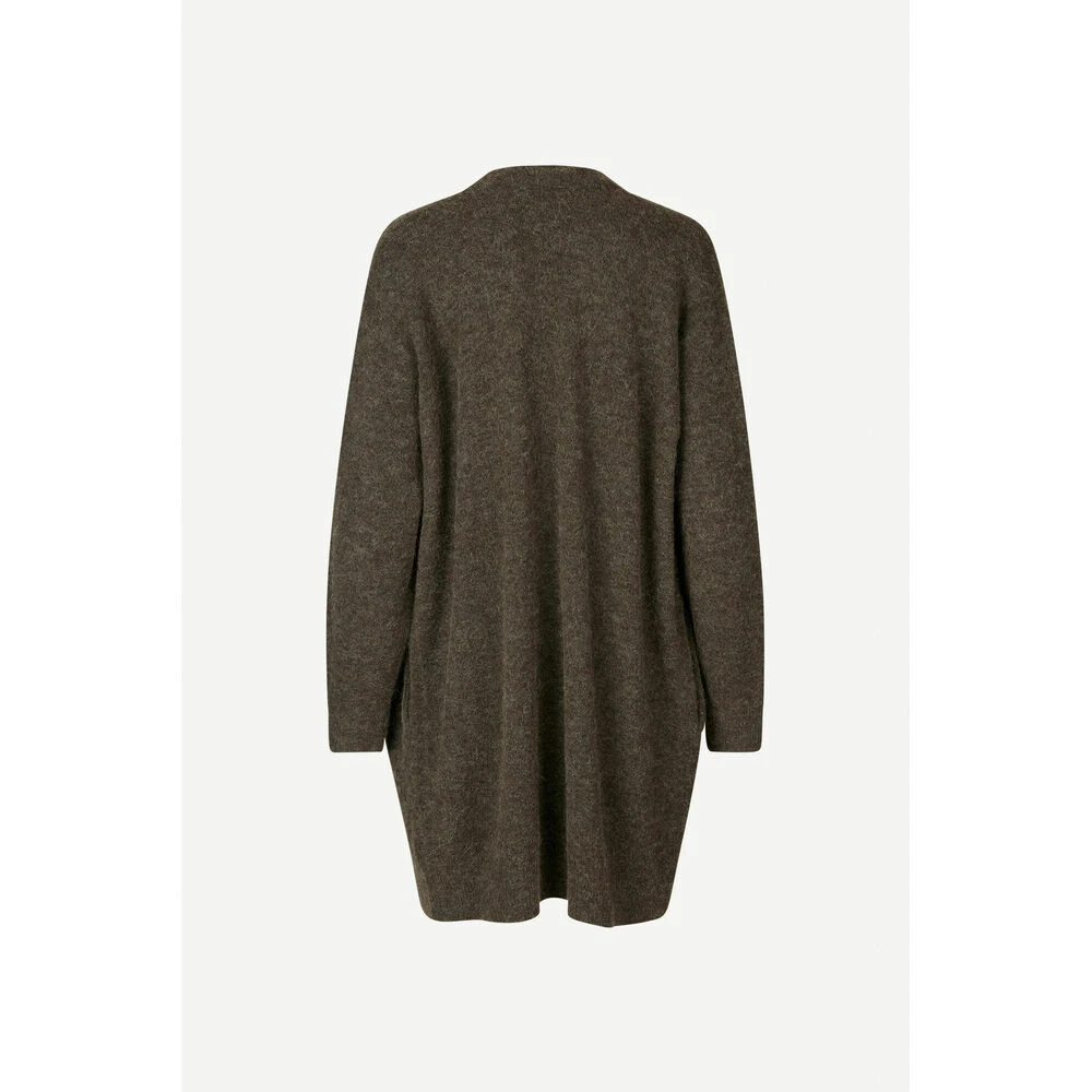 Denne cardiganen med lang linje er strikket i alpakka- og merinoullgarn. Festene er fjernet for å lage en enkel, lang strikket cardigan. Modellen vår er 177 cm høy og har på seg størrelse small.