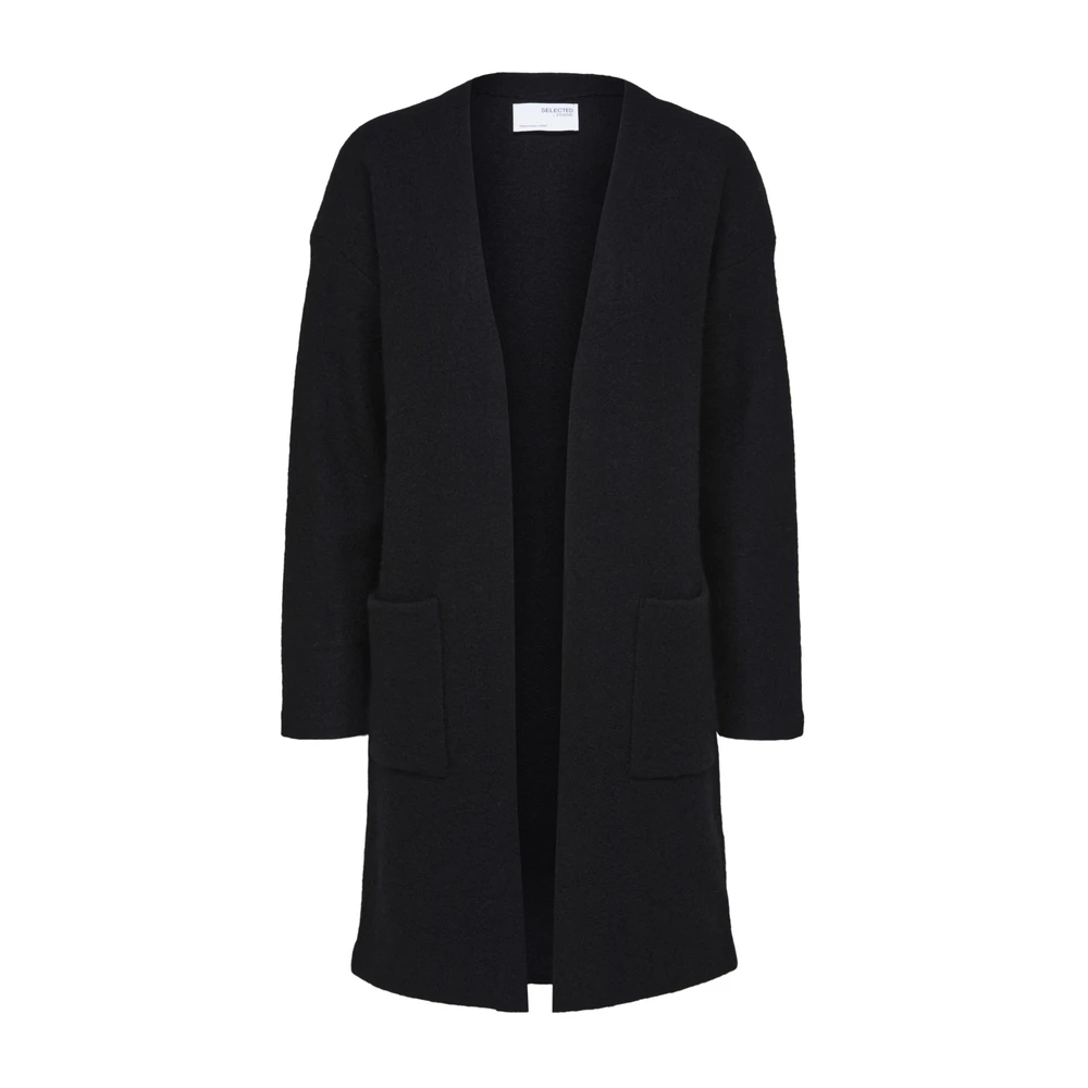 SLFDARLA LS Knit Cardigan er en svart cardigan fra valgt Femme. Det er jevnt og fint i stoffet, holder veldig bra. Sittende lommer foran og en middels lengde. Innhold: 100% ull