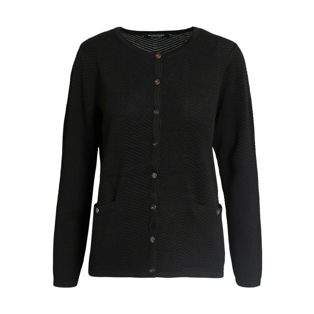 Fin og tynn Cardigan fra Signature i fargen Sort med veldig fint strukturmønster. Den har rund hals og 8 st. fine knapper som også er en av på hver lomme. Finnes også i fargen Rød. Lengde i st. M: ca. 61 cm.
