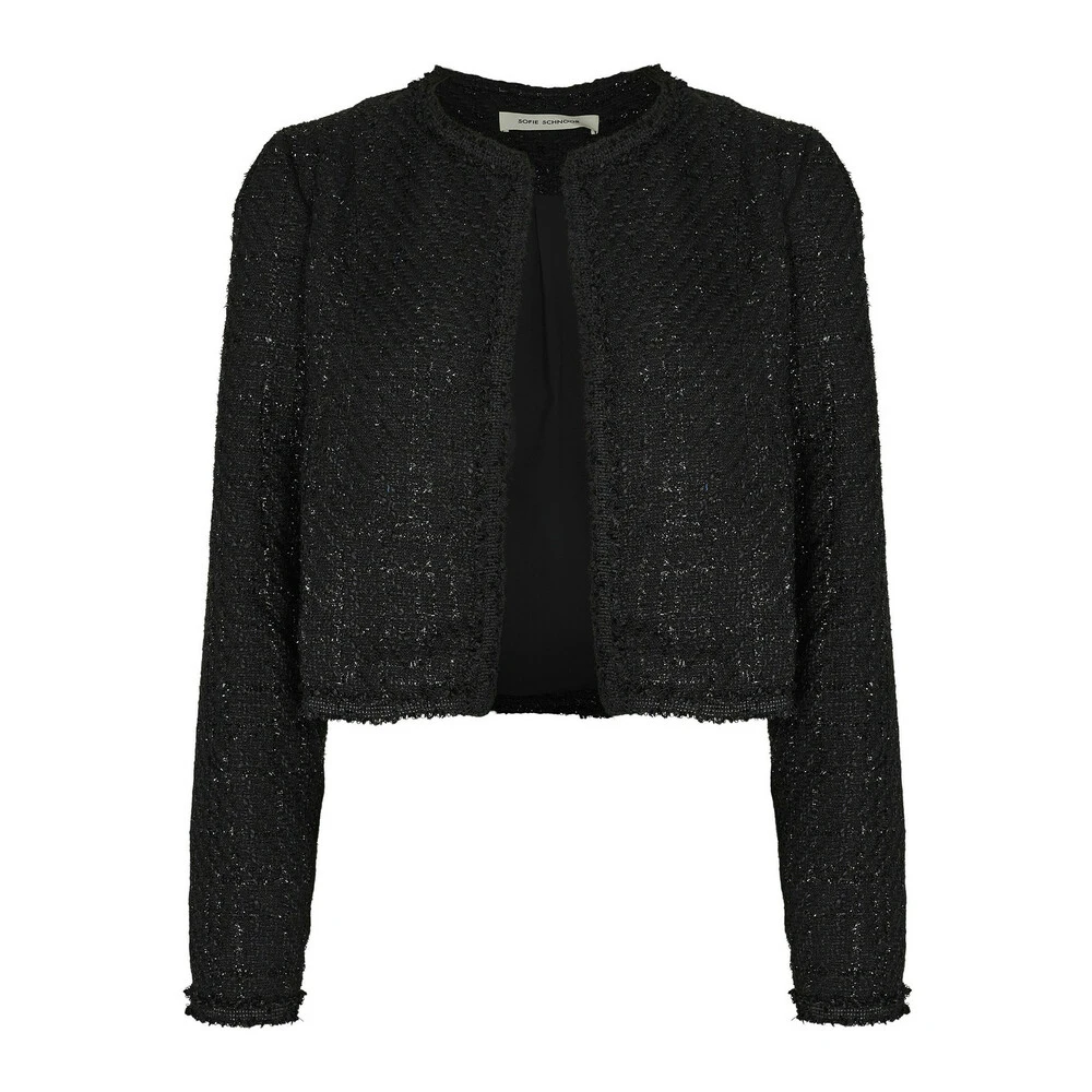 Kort blazer fra Sofie Schnoor med lange ermer, rund nakke og en smart rutete kvalitet med fin glimmer. · Fit: ALM · Dimensjoner: Str. S: Brystmål: 45 cm. x 2. Lengde: 49 cm. · Modell: S224228 Blazer S224228 Svart · Kvalitet: 100% polyester · Vask: 30 grader Skåne Wash