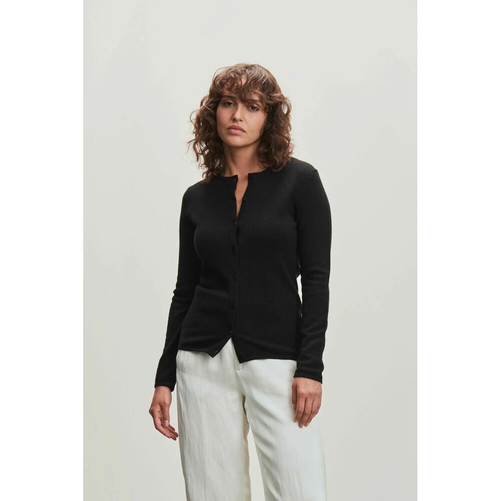 Navn : Davida Classic Cardigan Farge : Sort Beskrivelse: En ensfarget klassisk cardigan med 8 smĂĄ knapper som gĂĄr ton i ton. En cardigan med høy rund hals og smale ermer. Like fint oppknappet som ĂĄpent, sĂĄ bruksomrĂĄdene er mange. Style den gjerne med en t-skjorte, tanktop eller hvorfor ikke med en crisp skjorte. Materiale :100% kashmir – Lengden er 59 cm i størrelse Small