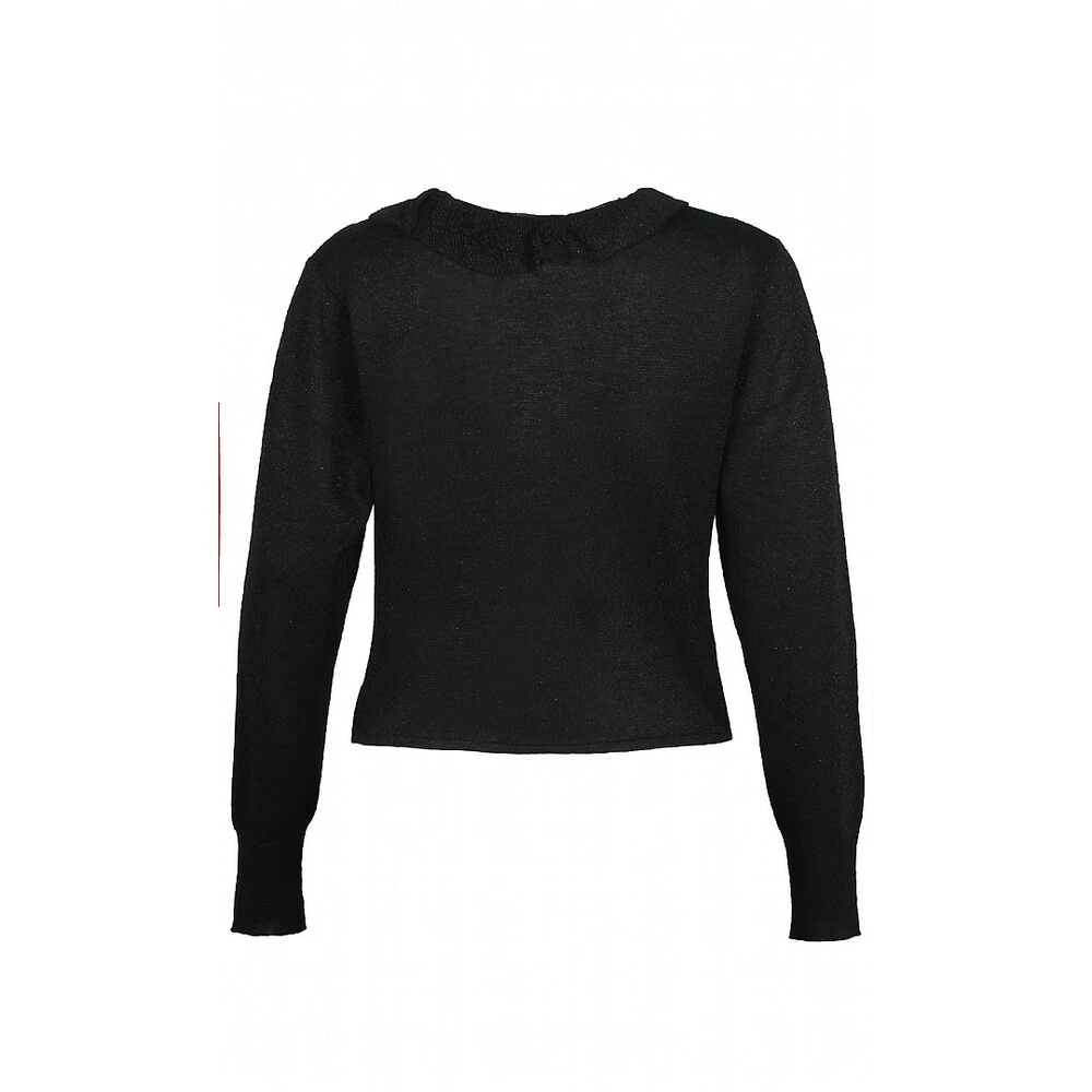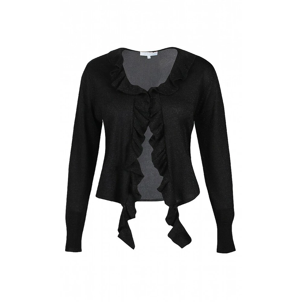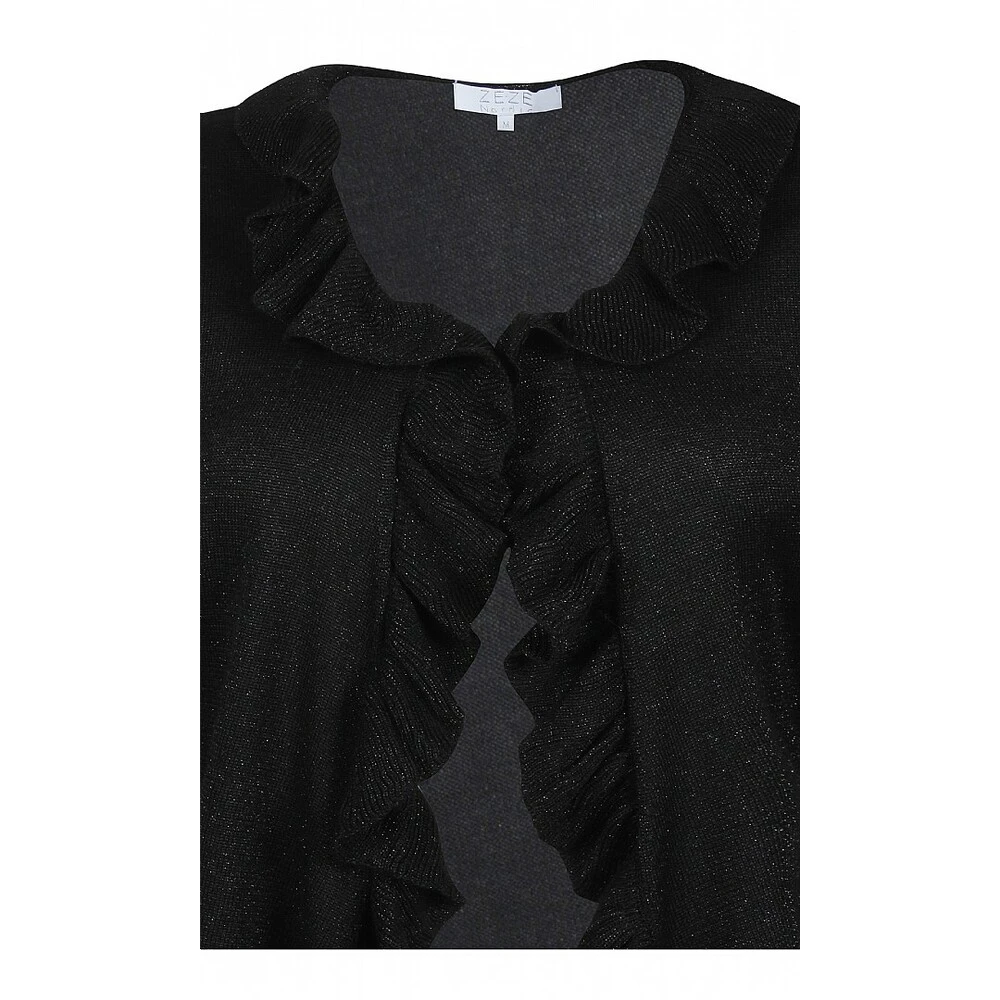 Cardigan fra Ze.Ze i sort og med glitter. Søt kort cardigan med volanger langs hals og front og med knyting foran. Innhold: 65% Viscose, 20% lurex. 15% nylon Vask: 30*